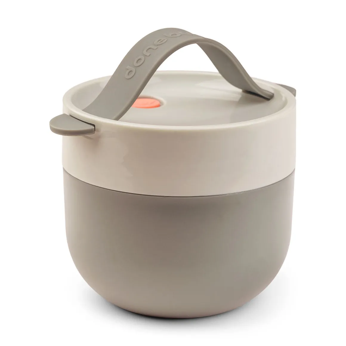 To go madbeholderen har et rent design i moderne farver. Et skruelåg holder godbidderne inde. Det aftagelige bærehåndtag i silikone gør det nemt for barnets hænder at bære skålen.