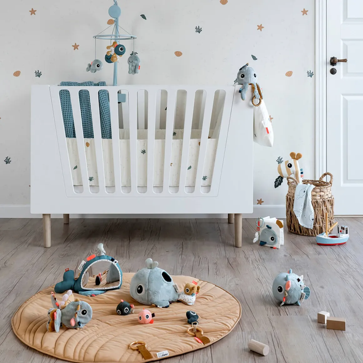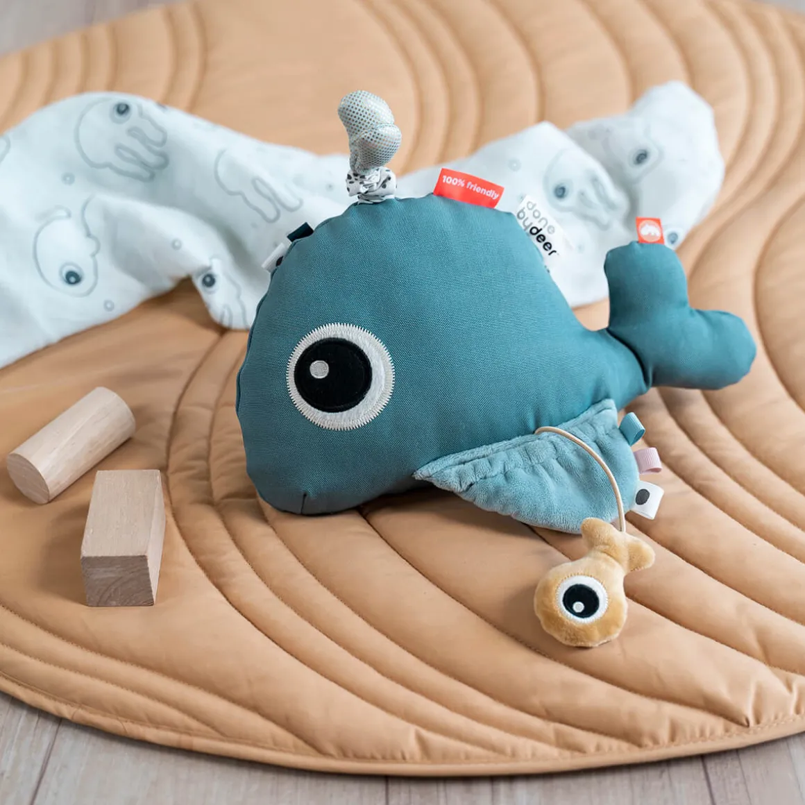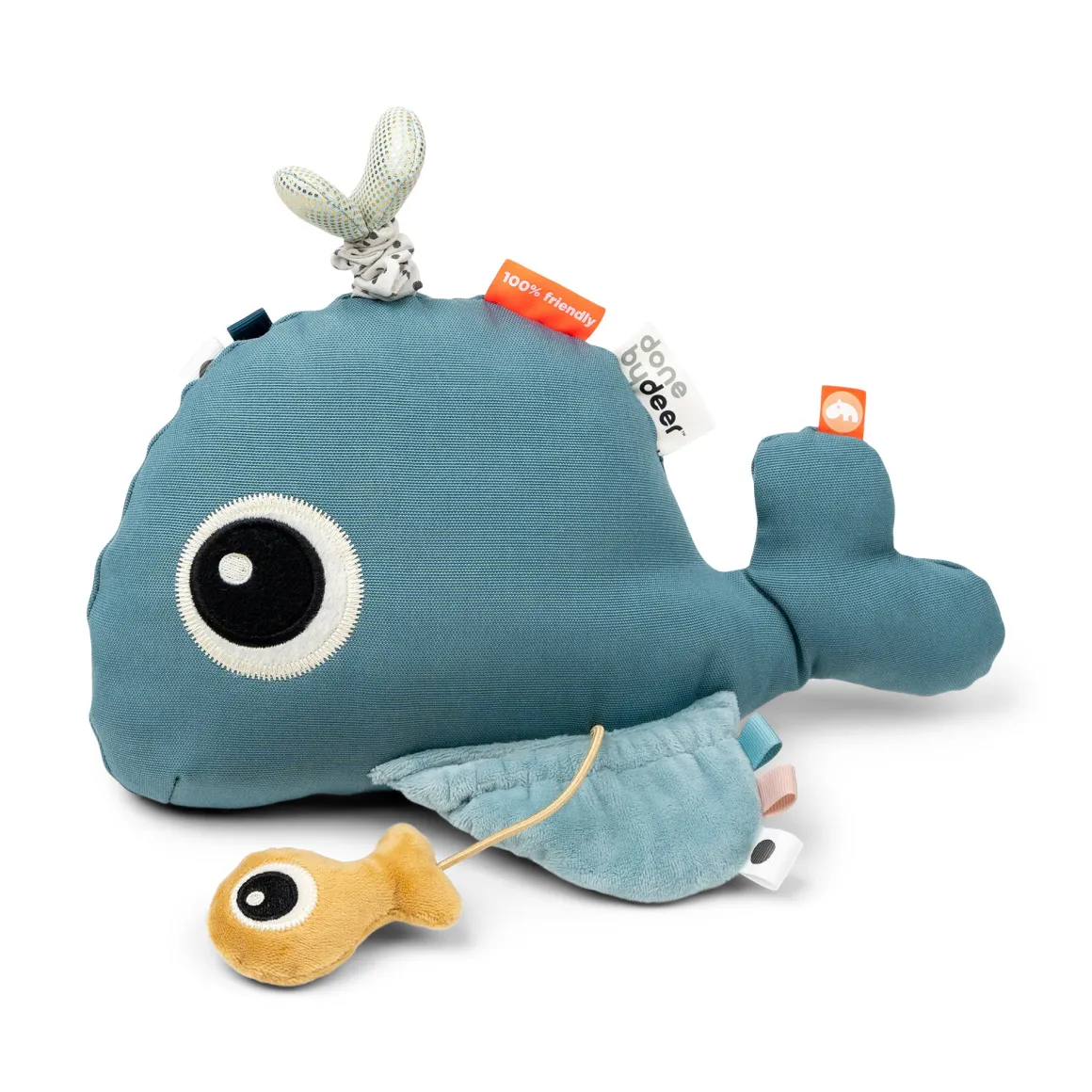 Spejlet, farverige mærker, taktile detaljer, knitre- og klokkelyde stimulerer de små sanser. Lad de små trække i vanddråberne på Wallys hoved og mærk hvordan hele hvalen vibrerer eller opdag hvordan Wallys fiskeven gemmer sig under hvalens finne. Wallys mange funktioner understøtter dit barns udvikling fra aktivitet på mave til siddende leg.