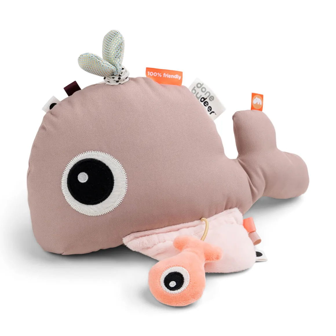 Kan din baby finde den lille fiske-ven når han gemmer sig under Wallys finne? Der er en masse sjov i vente for din baby: et sjovt spejl, farverige tags, taktile teksturer, knitre- og klokkelyde. Træk i vanddråberne og mærk hvordan alting ryster. Wallys mange funktioner vil styrke din babys udvikling fra maveleg til at sidde op og lege selv.