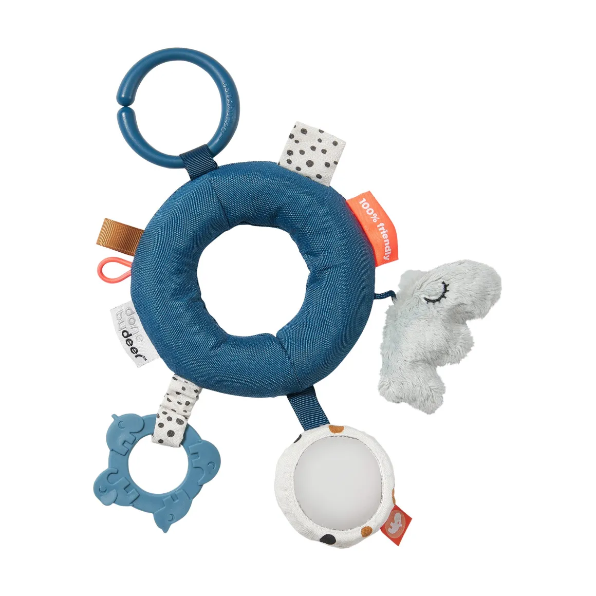 Sanse- & aktivitetsringen vil opmuntre babyer til at være nysgerrige og undersøge de sensoriske funktioner – en blød bidering til kløende gummer, et spejl med rangle, en blødt struktureret Ozzo, crinckle-lyde og sjove tags.