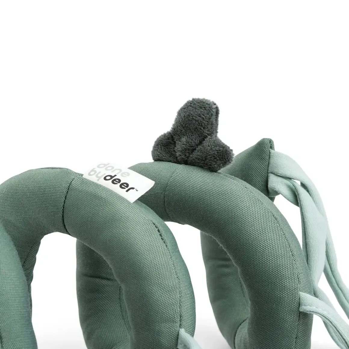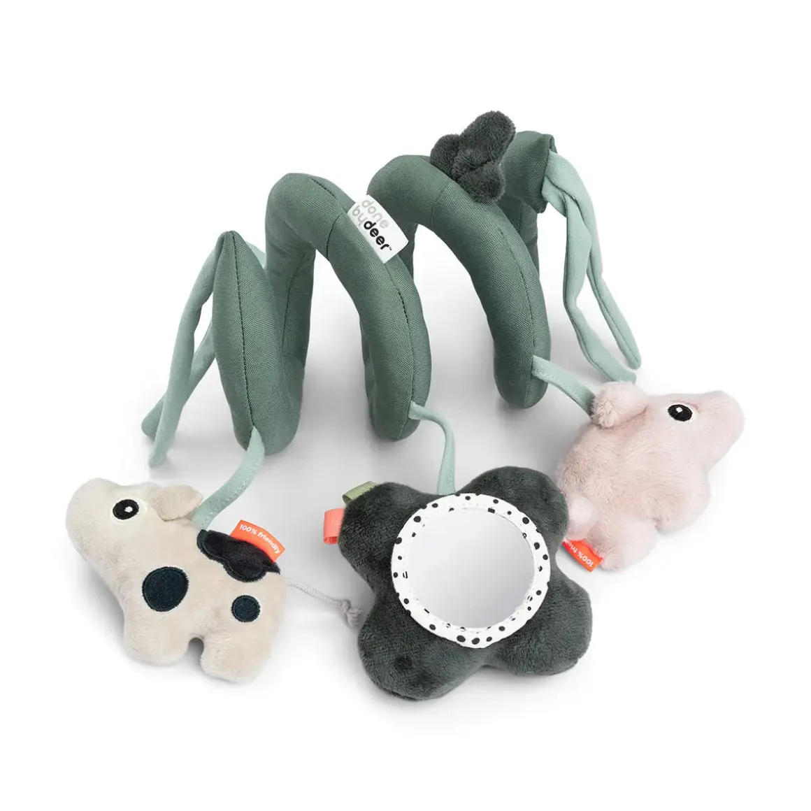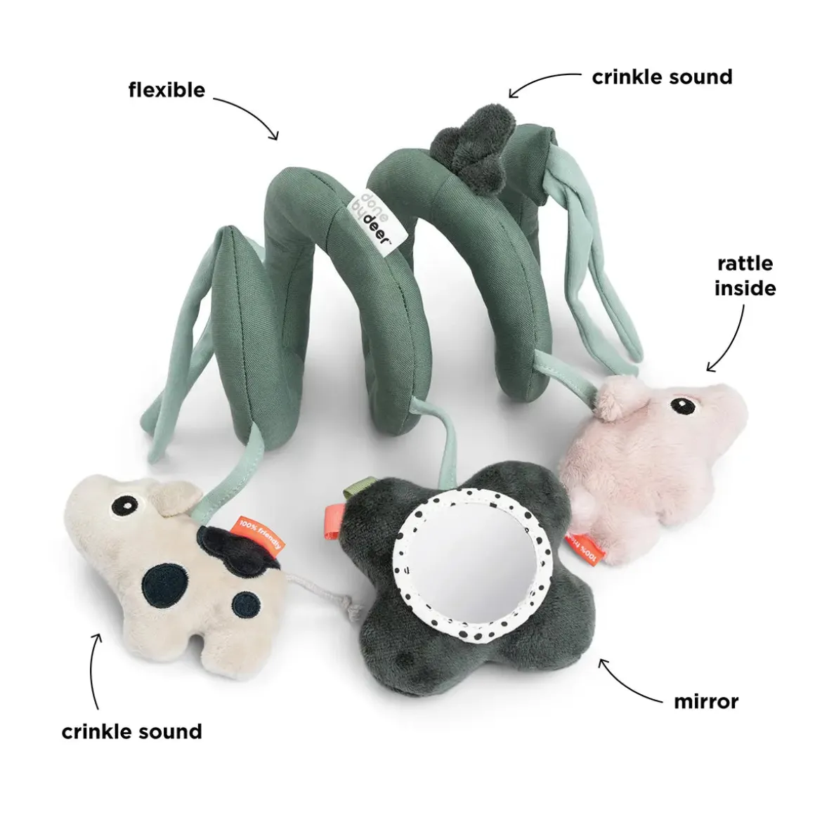 Lightweight and easy to bring along, the spiral can be fastened to a cot, car seat, stroller, or pram using the soft strings. With its cool green colour, colourful details, and playful contrasts, it offers visual stimulation while the Deer friends entertain your baby on the go.