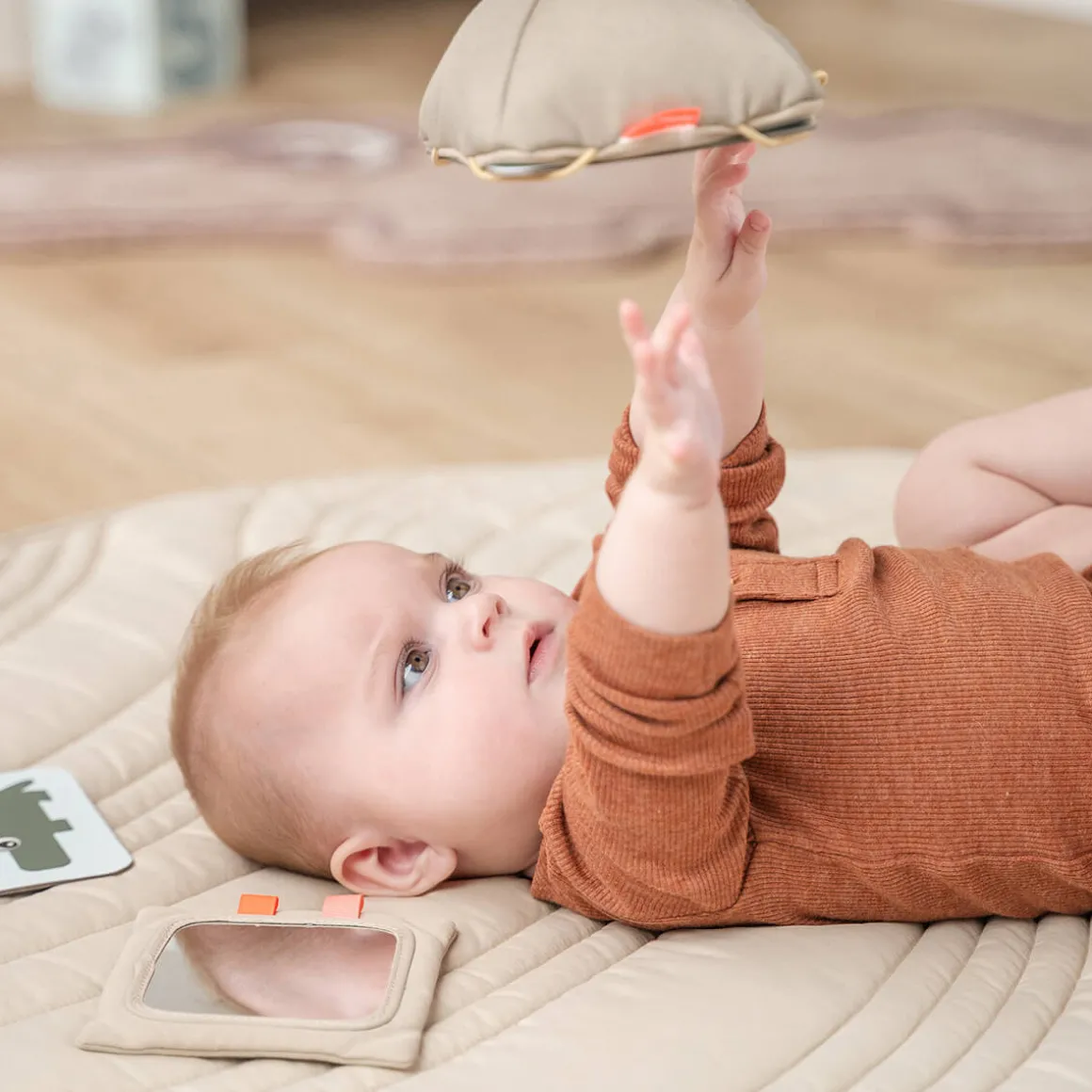 – Hæng det på en aktivitetsbue eller et legetæppe, eller læg det på gulvet til maveøvelser