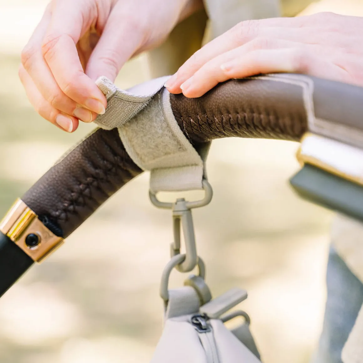 Denne bløde, sandfarvede Barnevognstaske – Sand er en praktisk og stilfuld måde at holde orden på dine og dit barns vigtigste ting og gøre dem let tilgængelige. Den fastgøres nemt til barnevognens håndtag ved hjælp af barnevognskrogene.