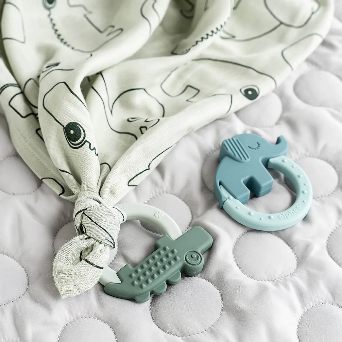 Bideringssættet er designet til at passe til selv den mindste hånd og stimulerer både barnets visuelle, orale og taktile sanser. Nuancer af blød blå og grøn, sjove teksturer og den søde elefant og sjove krokodille gør dette sæt til det perfekte første stykke legetøj.