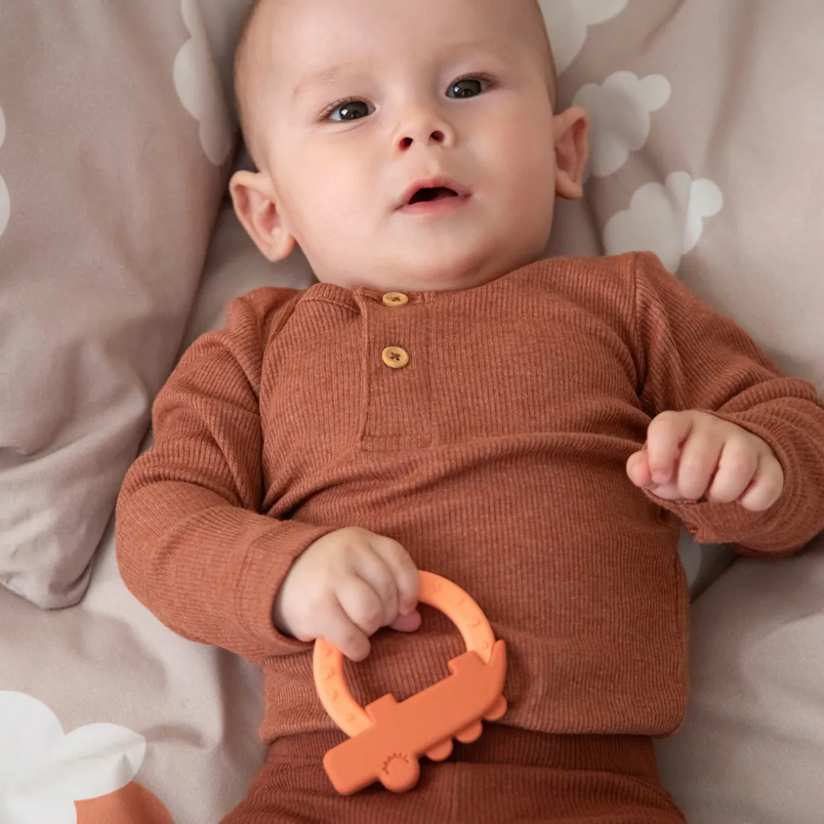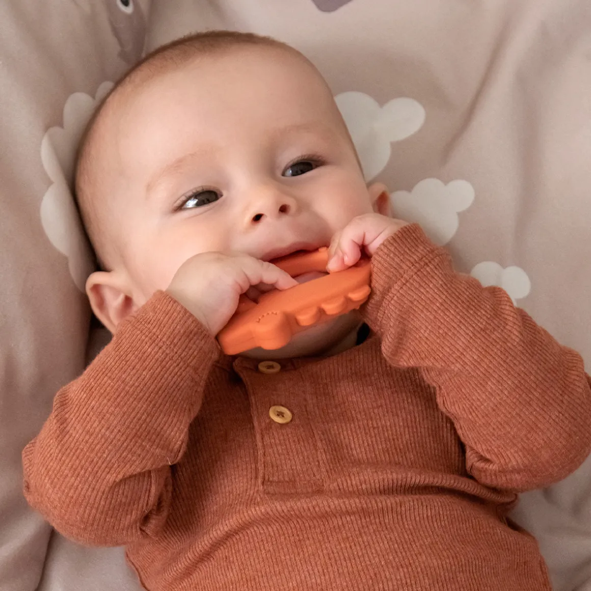Bideringssættet er designet til at passe til selv den mindste hånd og stimulerer både barnets visuelle, orale og taktile sanser. Nuancer af sand og papaya, sjove teksturer og den søde elefant og sjove krokodille gør dette sæt til et perfekt første stykke legetøj.