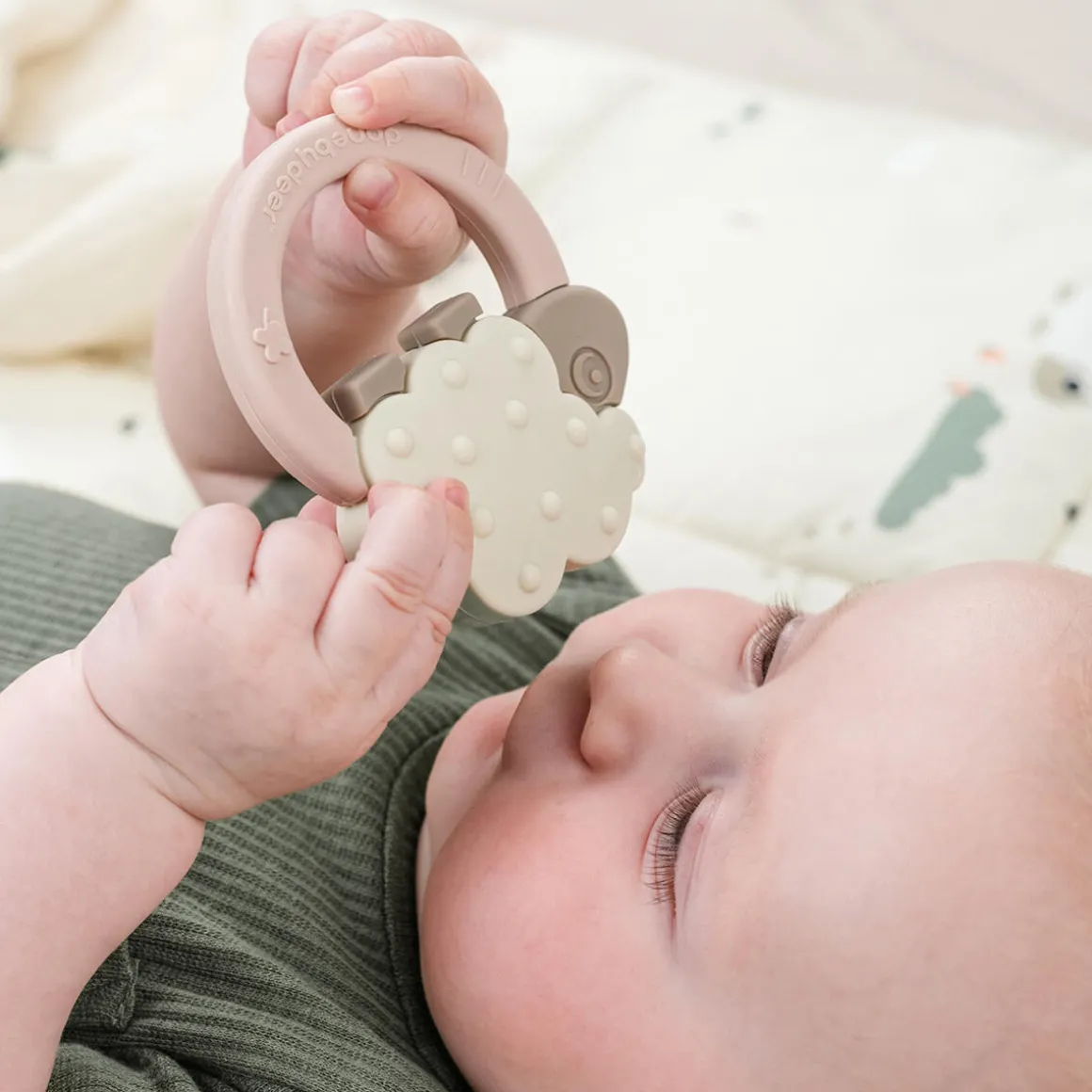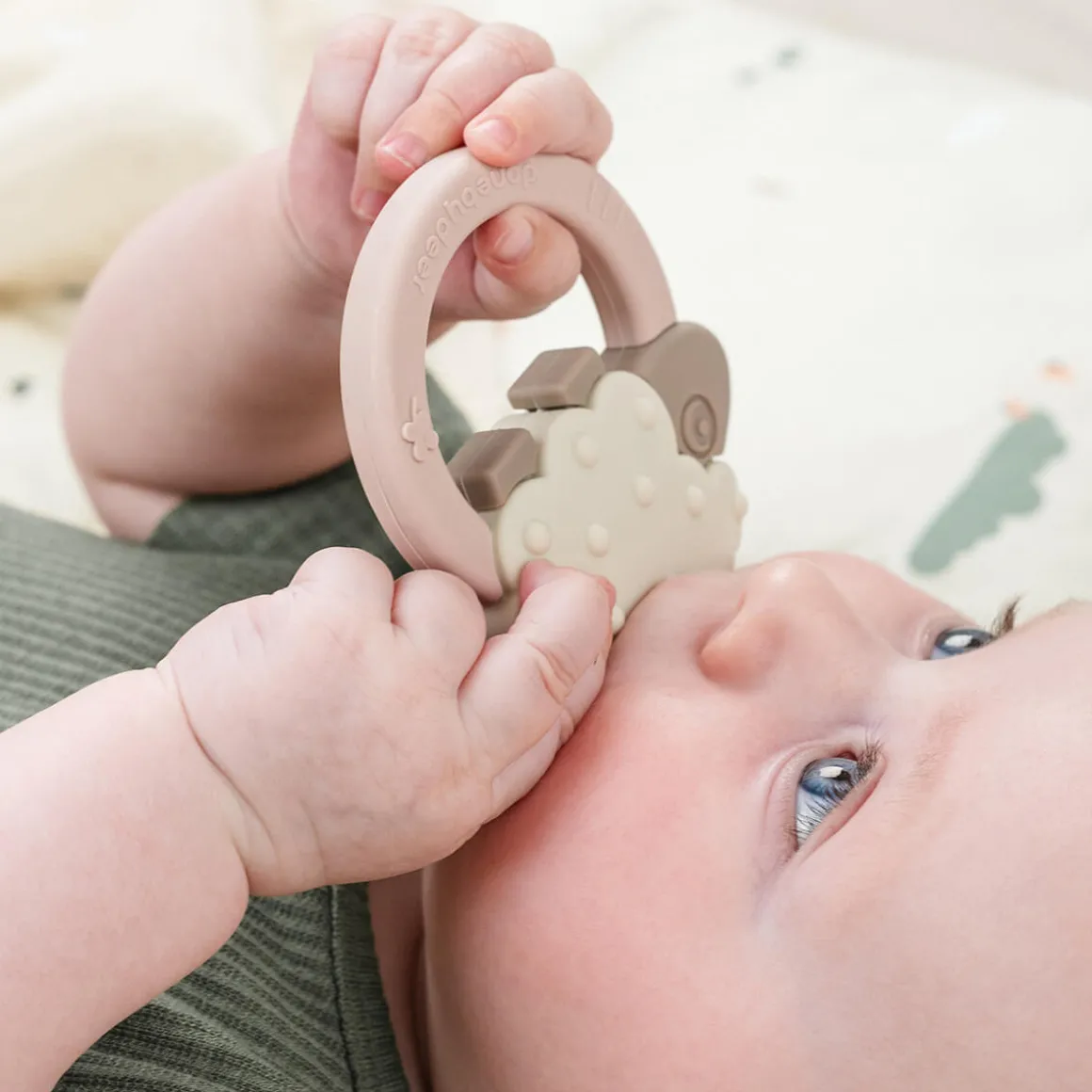 The different shapes and textures are designed to soothe sore gums, while the ring makes it easy for your little one to hold. For added relief, simply place it in the refrigerator. With a cute powder-coloured ring and a sand-coloured Sheepy, this teether brings both comfort and charm to teething time. Let a Deer friend help your baby through the teething journey.