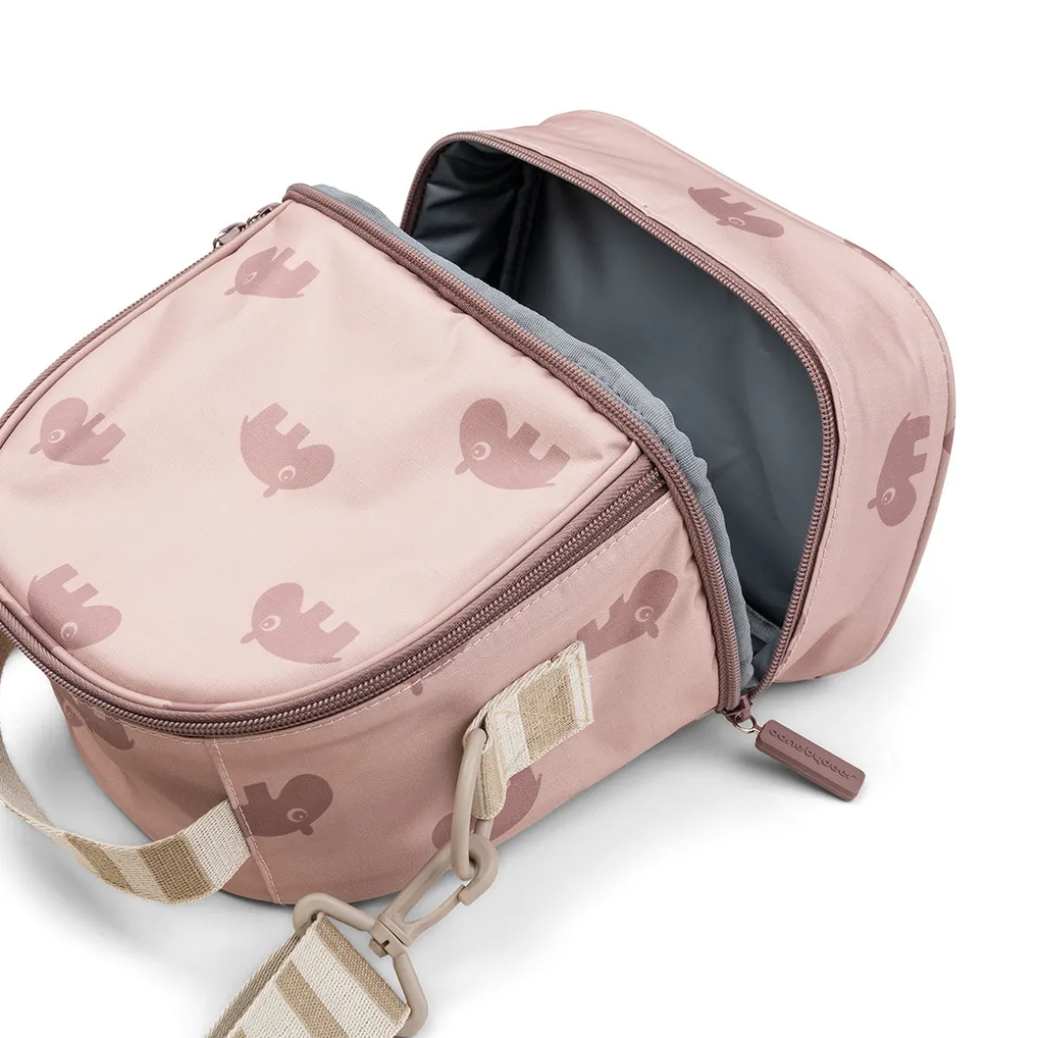 Den isolerede taske er designet i en flot pudderfarve med et all-over print af flodhesten Ozzo. Håndtag og skulderrem har Done by Deers signaturstriber i sand. Det slidstærke og vejrbestandige stof er nemt at rengøre med en fugtig klud.
