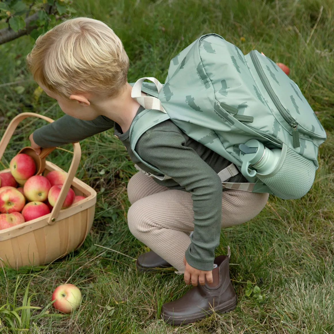 Børnerygsækken i grøn er dekoreret med den hjertevarme krokodille Croco. Den er lavet af 100 % polyester, som er slidstærkt og vejrbestandigt. Indeni er der et sjovt navneskilt, hvor Croco lover at passe på dig.