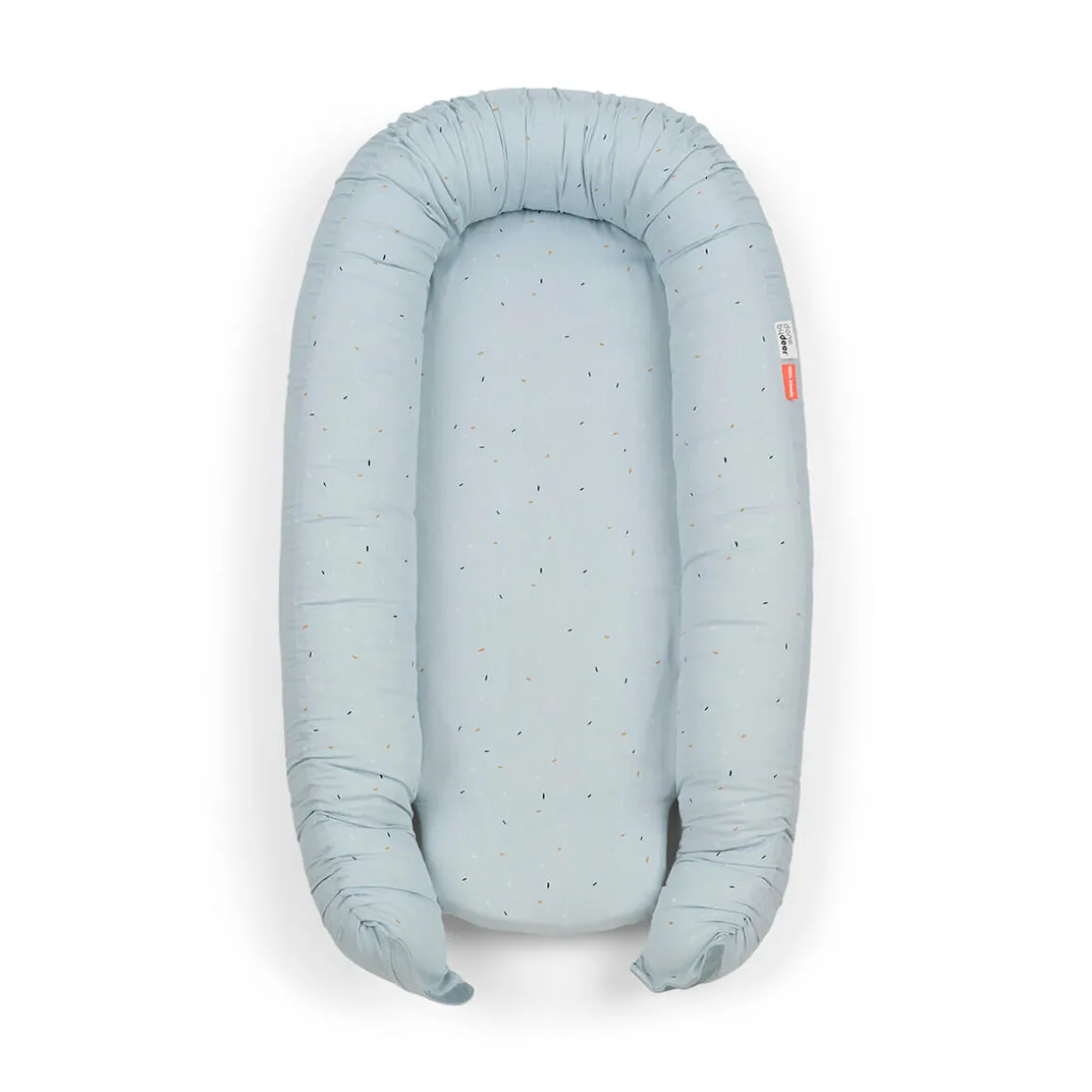 Den lyseblå cozy nest er drysset med festlig confetti på indersiden og har en ensfarvet blå farve på ydersiden. Babynesten er lavet af blødt bomuld med polyesterfyld og har en blød skummadras i ét stykke.