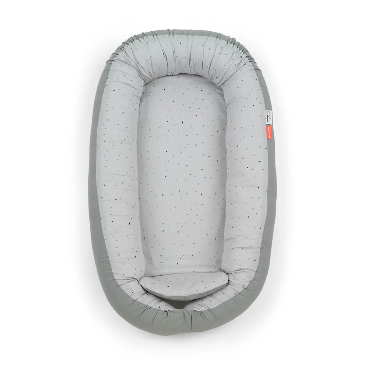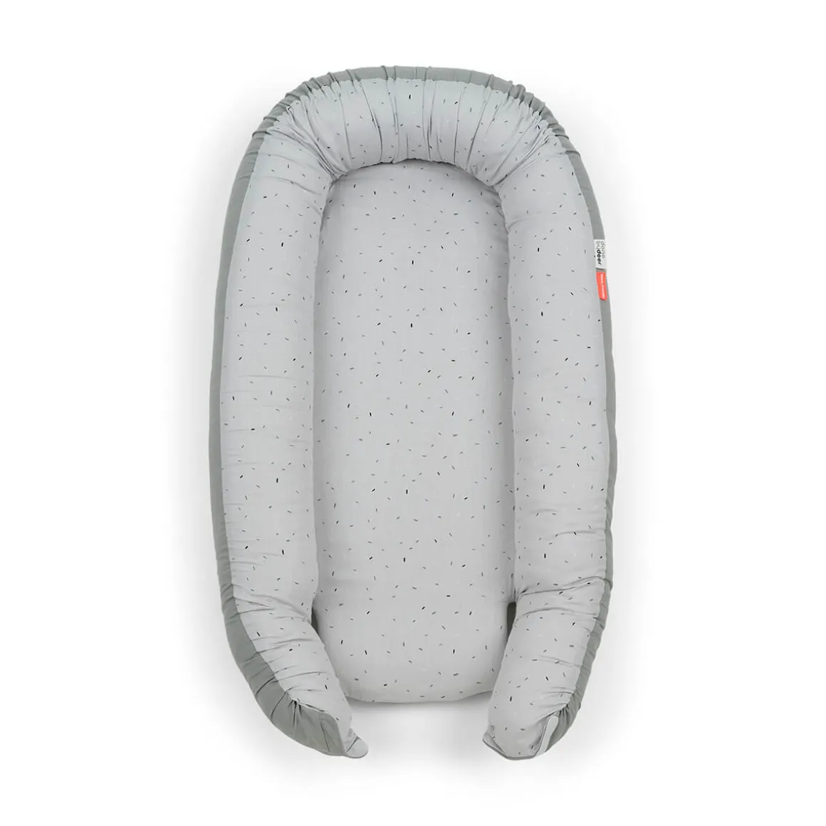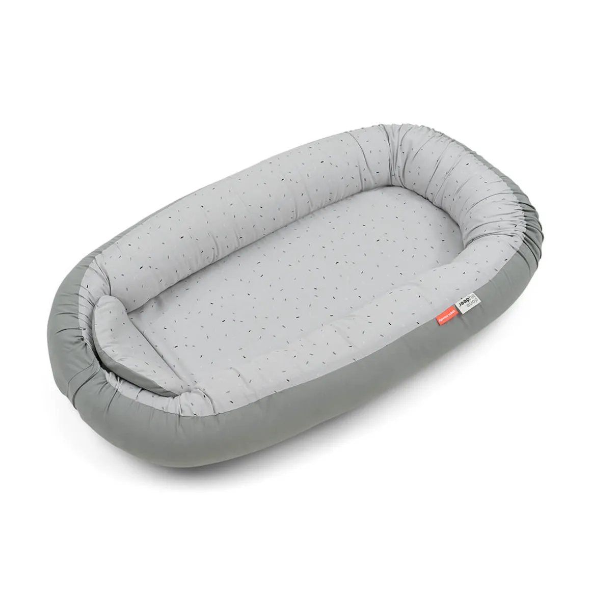 Den lysegrå cozy nest er drysset med festlig confetti på indersiden og har en ensfarvet grå farve på ydersiden. Babynesten er lavet af blødt bomuld med polyesterfyld og har en blød skummadras i ét stykke.
