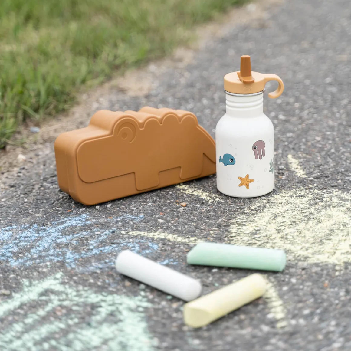 Den praktiske metalflaske har en lys sandfarvet nuance og er dekoreret med Jelly og Wally i deres rette element blandt muslingeskaller, koralrev og søstjerner.