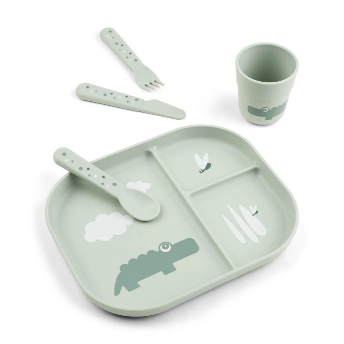 Det grønne sæt er trykt med et sejt motiv af krokodillen Croco, der kigger på et par ildfluer. Crocos nysgerrighed vil inspirere dit barn til at udforske maden på tallerkenen.