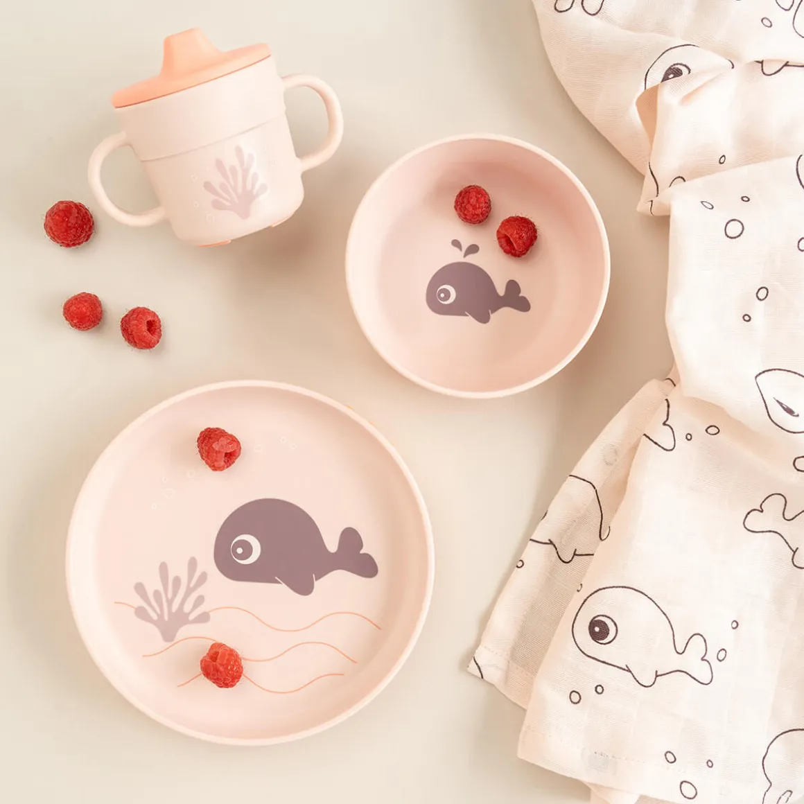Pudder spisesættet har et motiv af Wally på undervandsekspeditioner. Den 2-grebs tudkop er dekoreret med muslingeskaller og søstjerner. Koral-farven giver en flot tofarvet detalje, og skålen har seje bølger. Lad dit barn dykke ned i det.