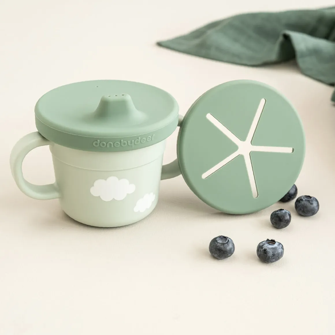 Foodie tud/snack kop sæt er perfekt til de mindste. Snacklåget holder snacks inde, perfekt til bilen eller barnevognen. Tudelåget er spildsikkert, og når dit barn er klar, kan du bruge koppen uden låg. De to håndtag giver et stabilt greb.