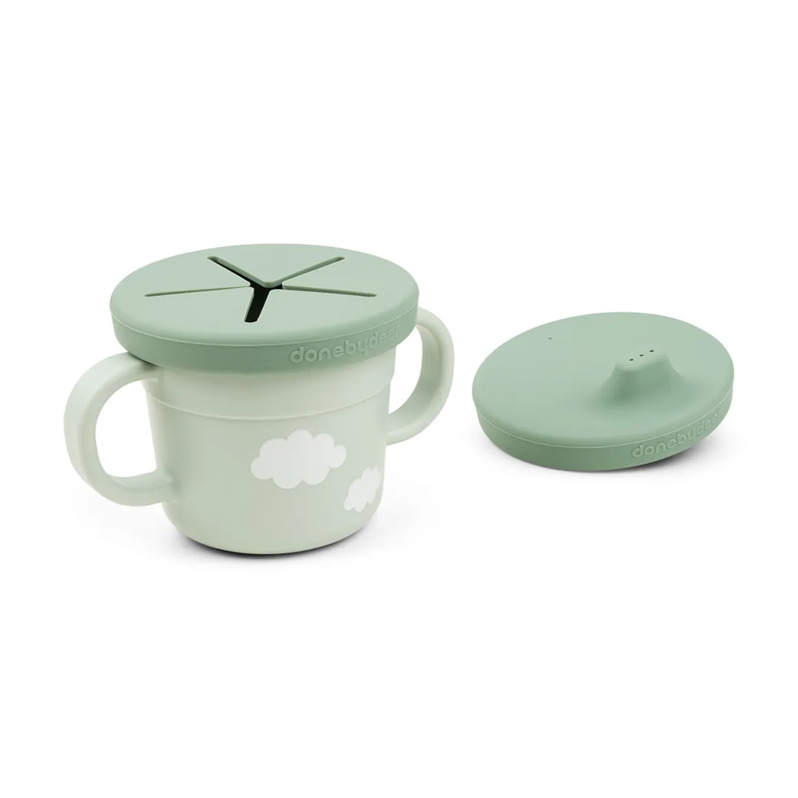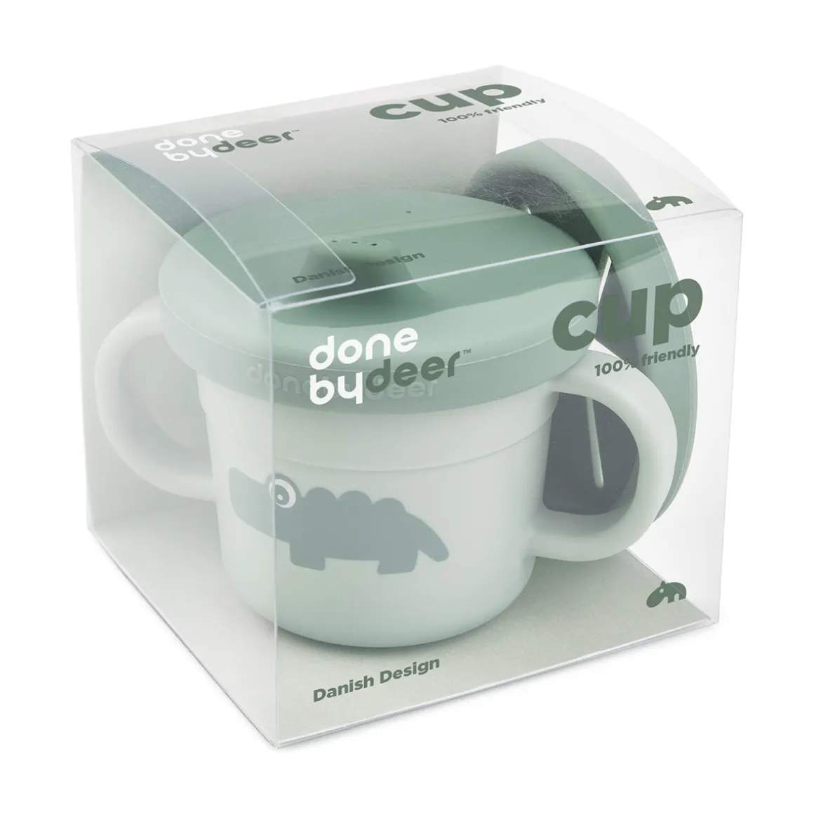 Den seje grønne tud- og snackkop er trykt med den hjertevarme krokodille, Croco, på den ene side og skyer på den anden. Tudelågets mørkere grønne farve giver en fin tofarvet detalje.
