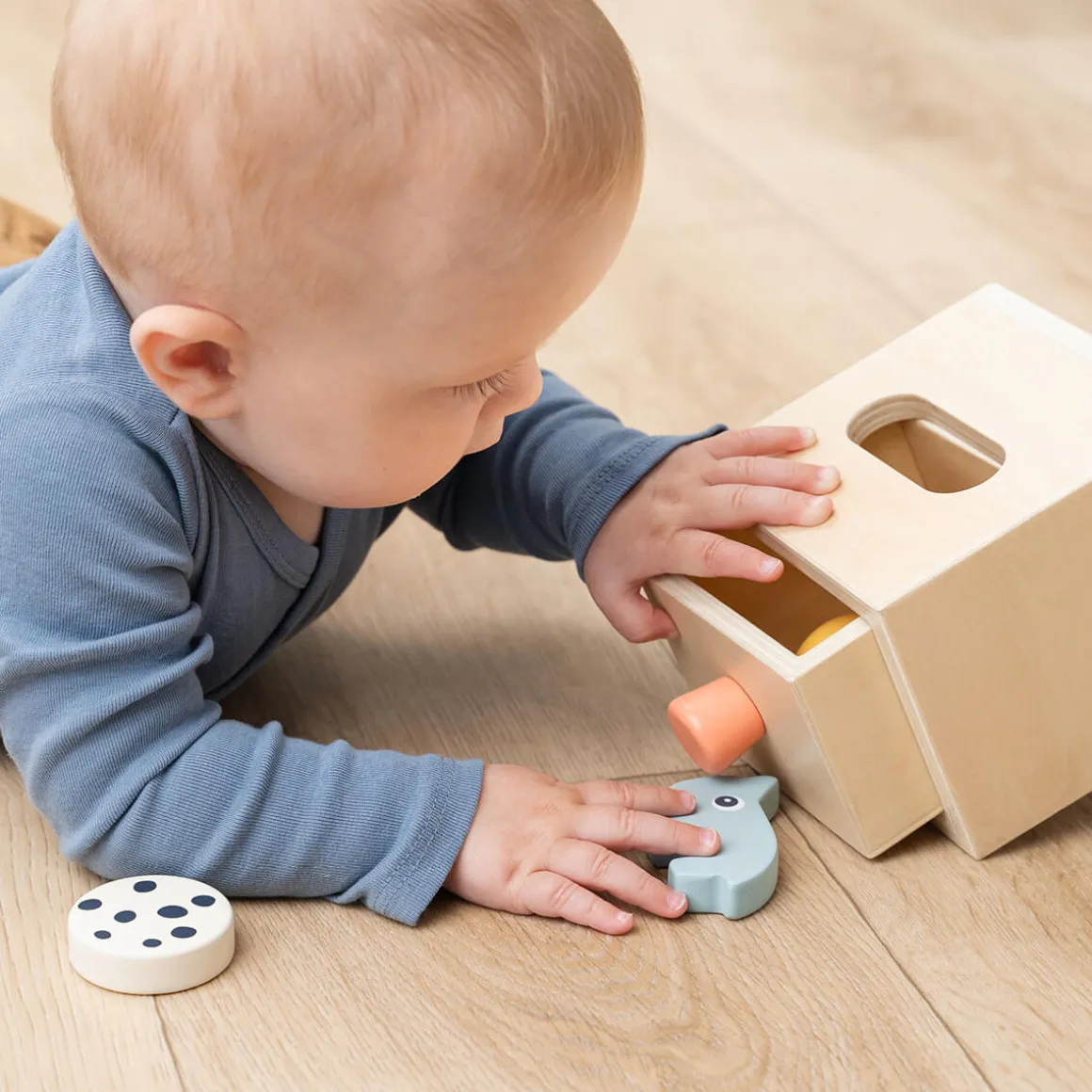 Lad dit barn se og lære, når ting forsvinder, hvilket øger glæden ved at opdage og styrker forståelsen. Boldens ranglende lyd giver auditiv stimulering, og når du vender æsken, får du en mere udfordrende hulform. For ekstra sjov kan du bruge et legetørklæde eller en klud til at trække tingene ud. Fremstillet af ansvarligt indkøbt træ og malet med sikker, vandbaseret maling, hvilket sikrer en sikker og sjov legeoplevelse for dit barn.