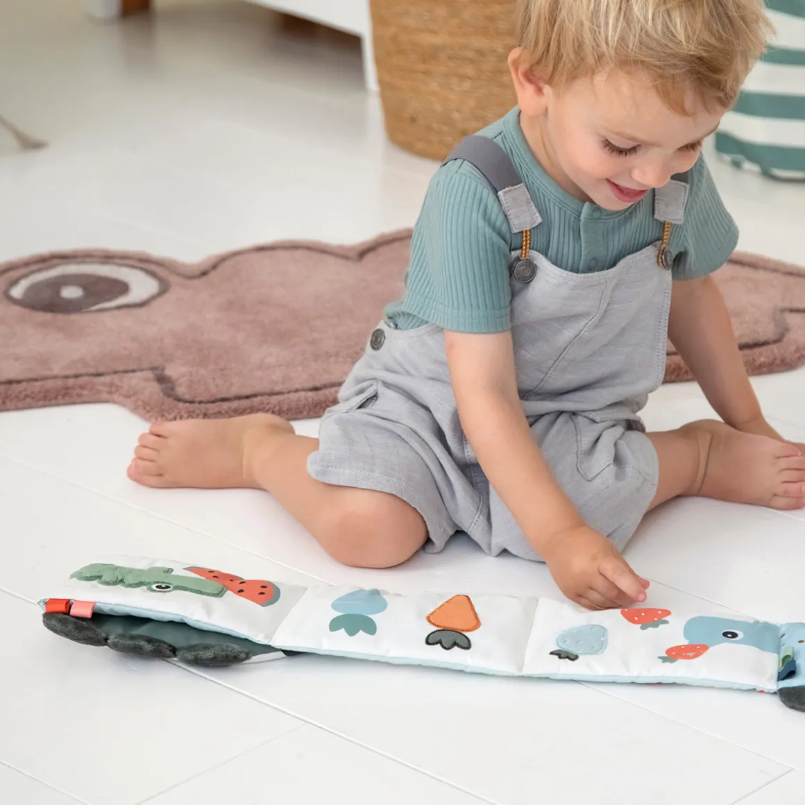 Det søde børnetæppe er formet som krokodillen Croco. Det har en blød og behagelig overflade, der er perfekt til sjove og legende stunder derhjemme. På bagsiden af tæppet har Croco praktiske skridsikre prikker.