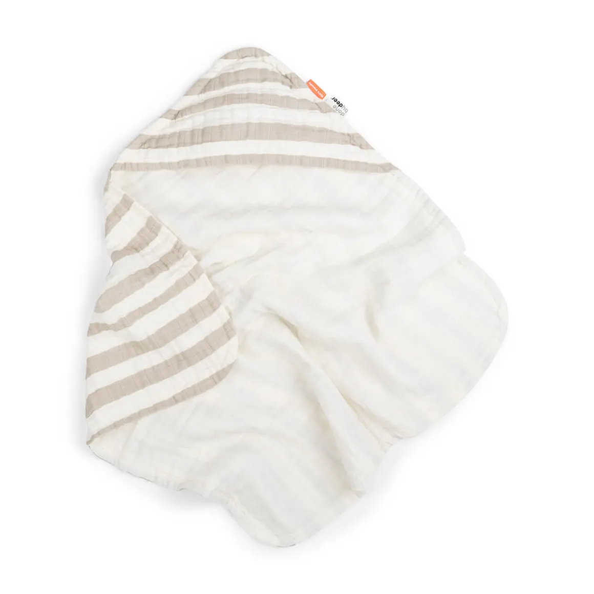 Hættehåndklædet med brede striber er perfekt til at pakke de små ind i og tørre dem efter et dejligt bad. Det bløde håndklæde af økologisk bomuld i flere lag er let, glat mod huden og tørrer hurtigt på en tur til stranden.