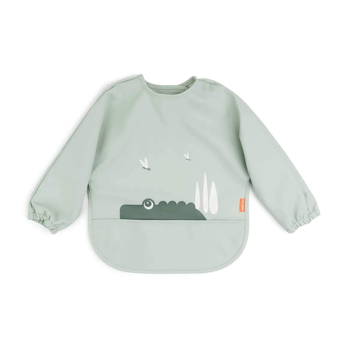 Den bløde hagesmæk er vandtæt med praktiske elastikærmer, der holder barnets krop tør. Hagesmækken med ærmer er nem at tørre af, hvilket sparer dig for en masse rengøringstid! Den søde grønne hagesmæk er dekoreret med Deer friend Croco og fluer.