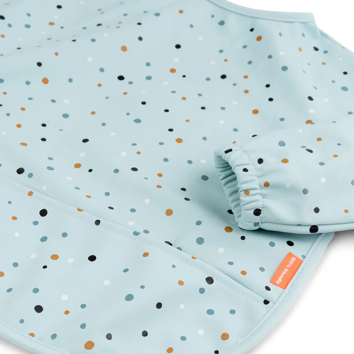 Den bløde hagesmæk er vandtæt og har praktiske elastiske ærmer, som holder den lille tør. Den er nem at tørre af og sparer dig for en masse rengøringstid.