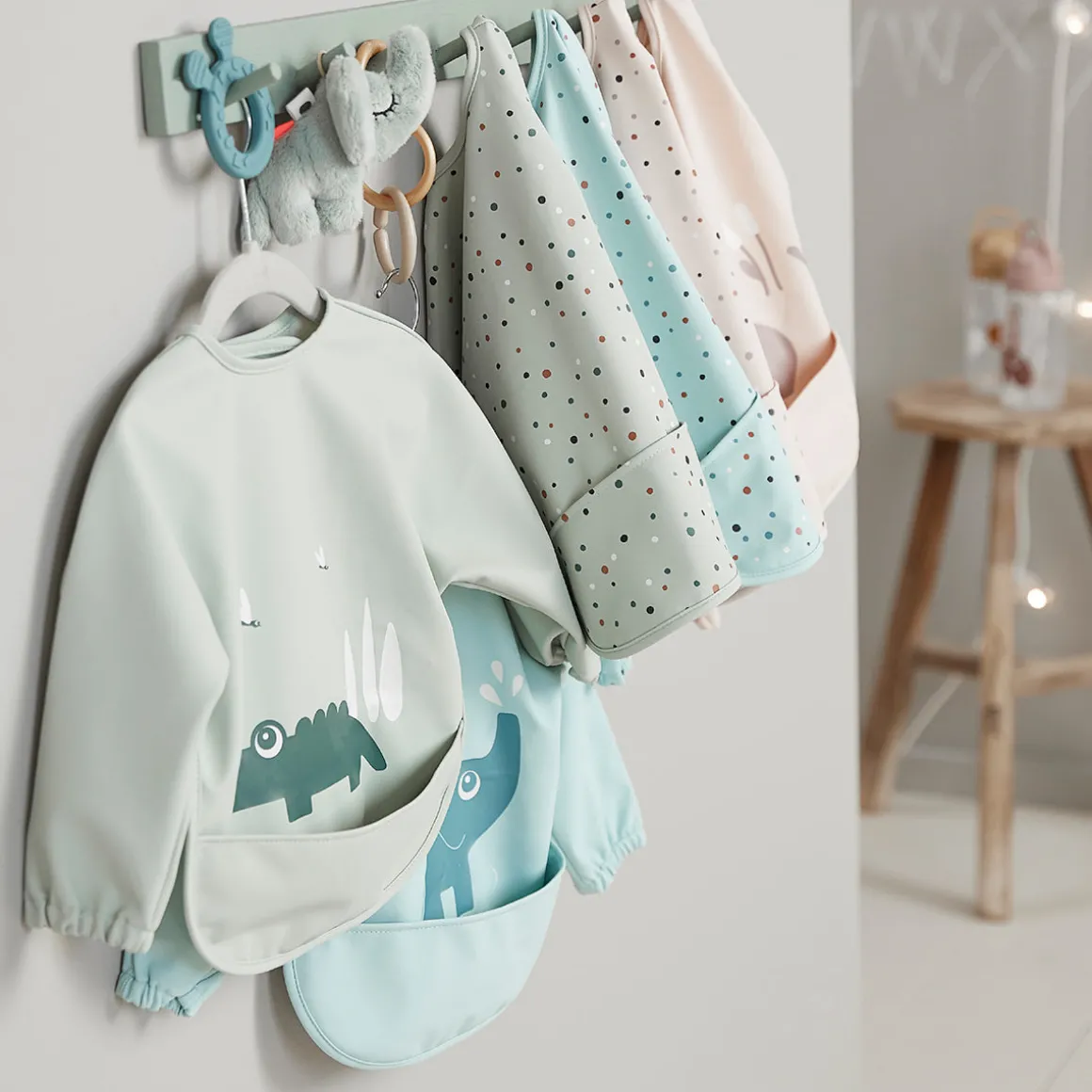 Ozzo hagesmækken m/ærmer og lomme beskytter din lille spiser ved måltiderne, eller når det er tid til at være kreativ med maling, modellervoks og lignende. En justerbar dobbeltlukning sørger for, at hagesmækken i pudder passer til både babyer og småbørn.