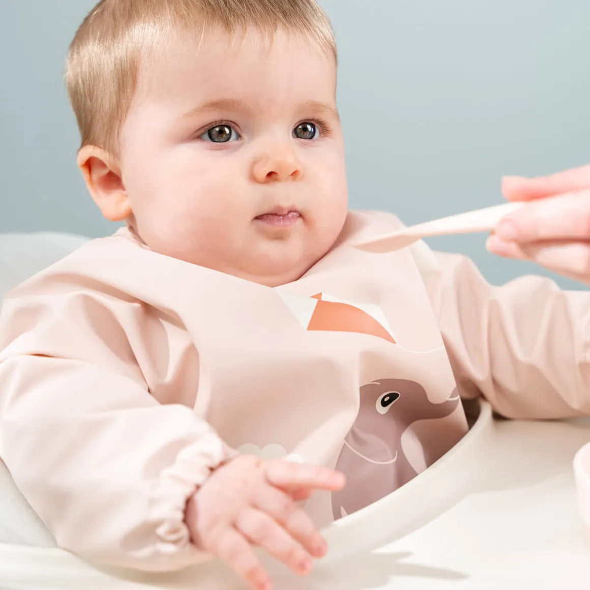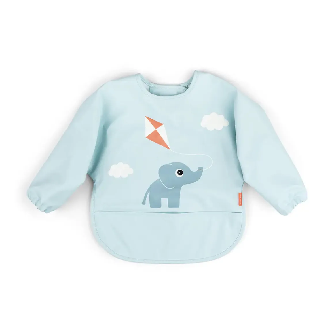 Denne skønne blå hagesmæk har et sødt motiv af Elphee, der flyver med en drage. Hagesmækken sikrer renlighed med sin vandtætte overflade, der beskytter tøjet mod spild og snavs. Tilføjelsen af beskyttende ærmer giver ekstra dækning og holder dit barns tøj sikkert.