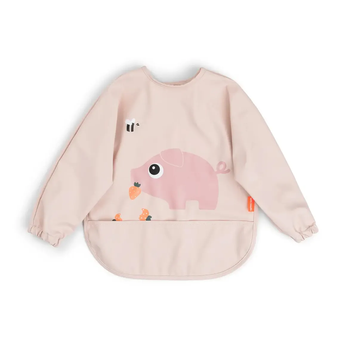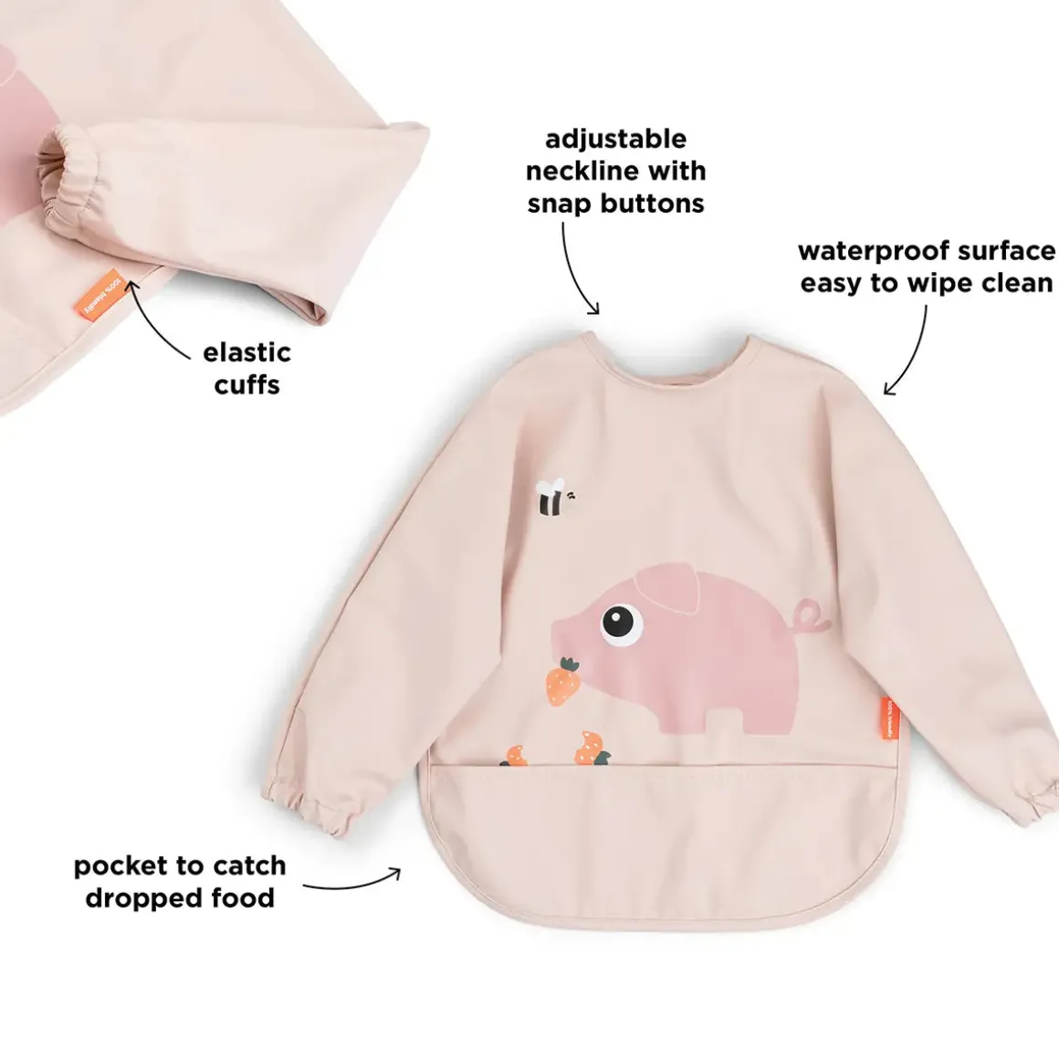 The water-repellent surface and sleeves ensure clothes stay dry and clean, while also making it super easy to wipe down. The adjustable double closure provides a comfy, secure fit, and the cute powder colour with a playful Pigee motif adds a fun touch to mealtime.