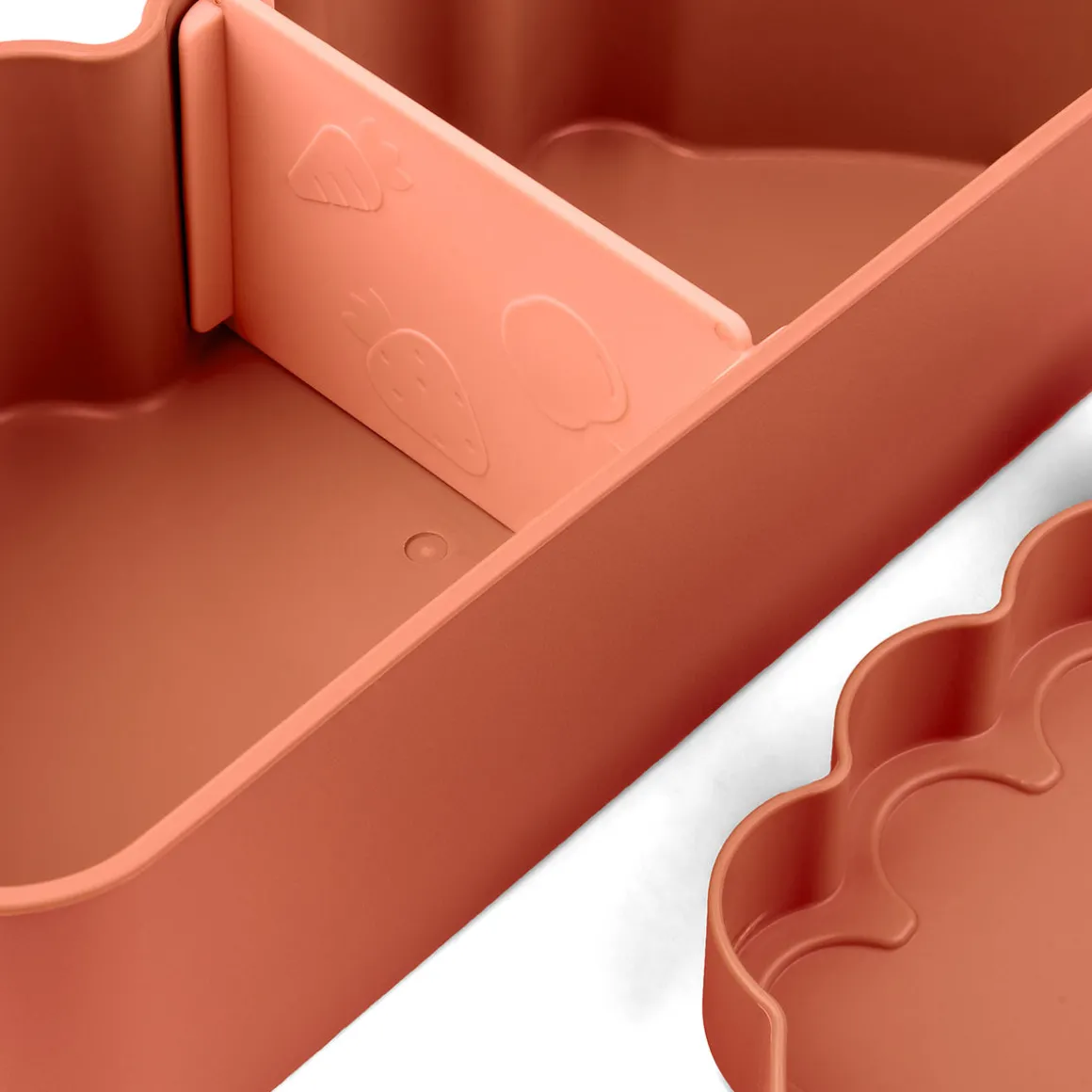 Det er nemt for små hænder at åbne og lukke den praktiske krokodilleformede madkasse, og låget kan bruges som tallerken. Den seje madkasse i Papaya tåler opvaskemaskine.