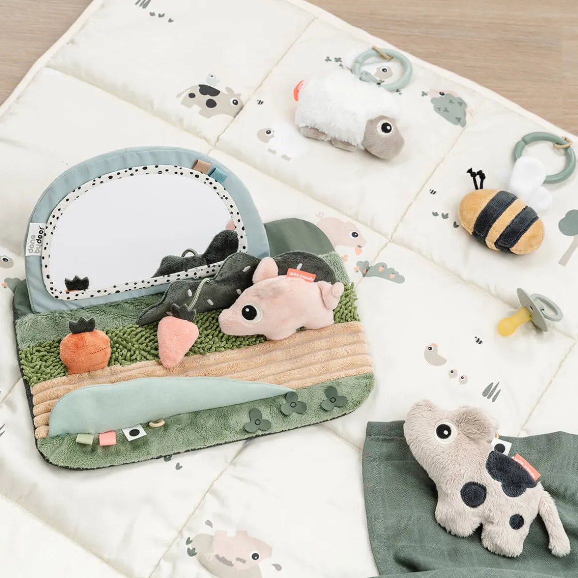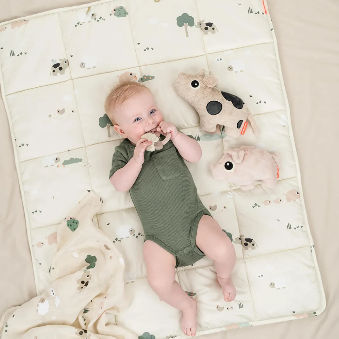 The mat is easy to fold, making it perfect for visits or weekend trips. Reversible with a cute print on one side and soft sand on the other, it offers versatility and style. Featuring cute motifs of Dotti, Pigee, and Sheepy, this play mat adds a playful touch to your baby’s playtime adventures.