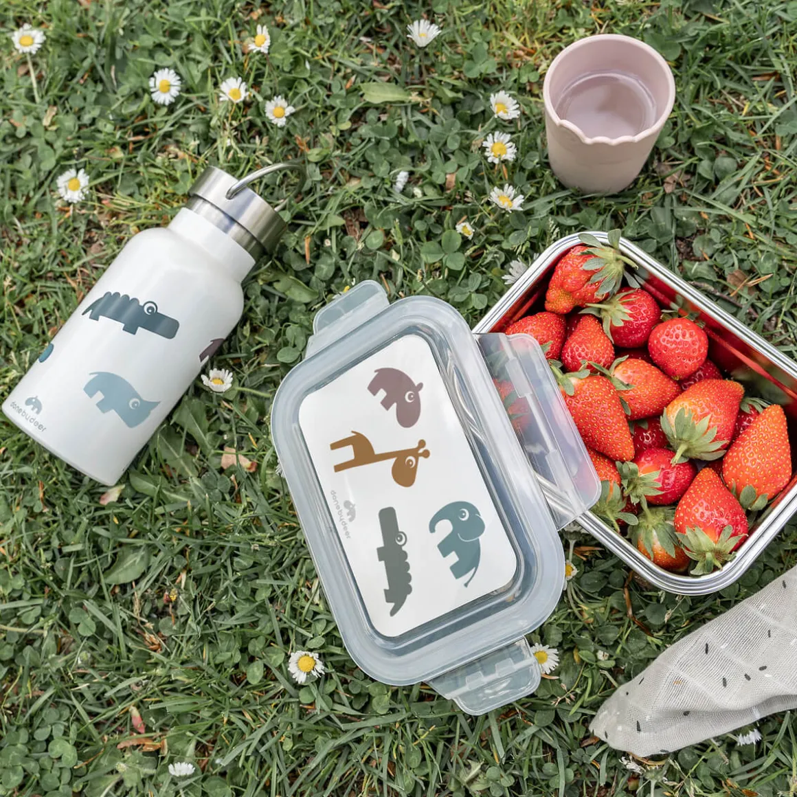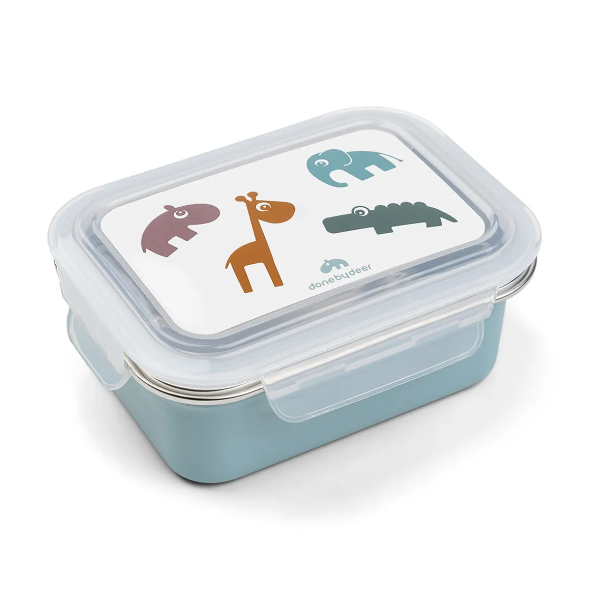 Den praktiske madkasse i rustfrit stål er i en blå tone. Låget er dekoreret med Deer friends Croco, Elphee, Raffi og Ozzo i bløde nuancer af grøn, blå, sennep og pudder.