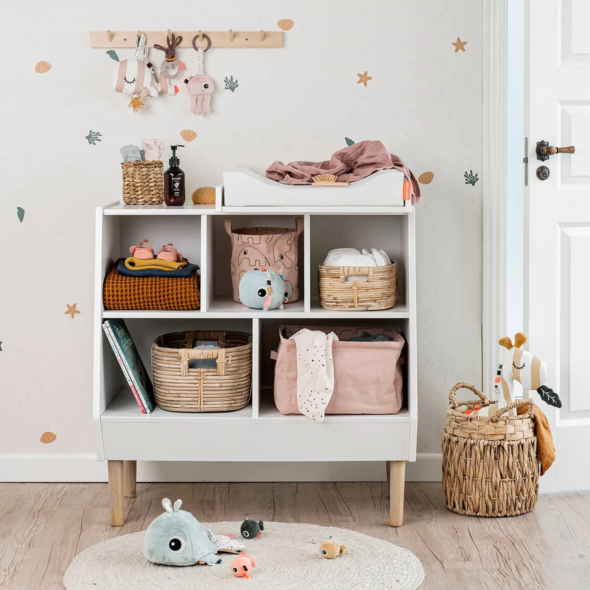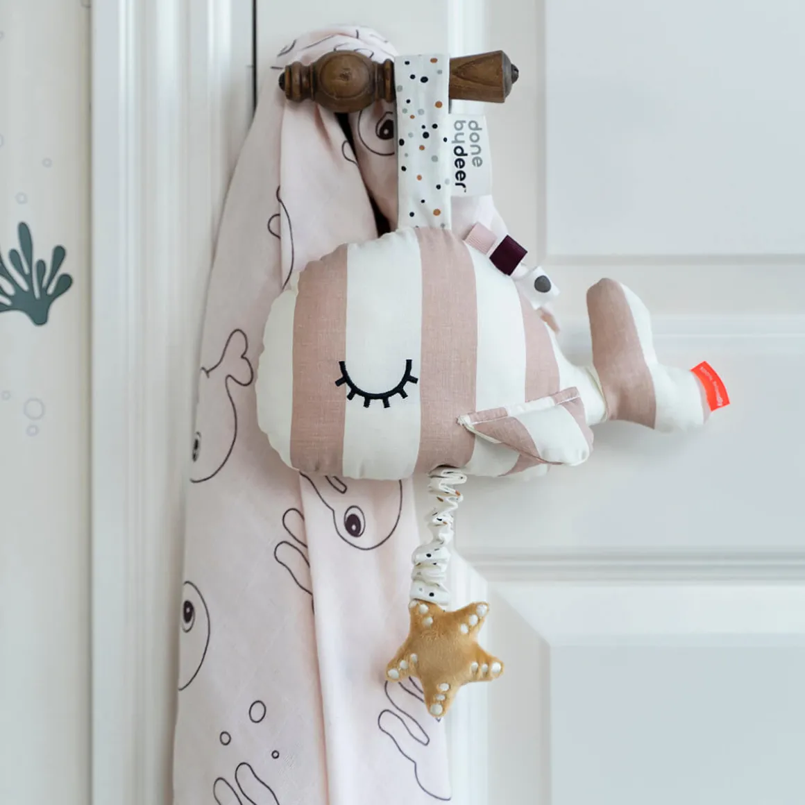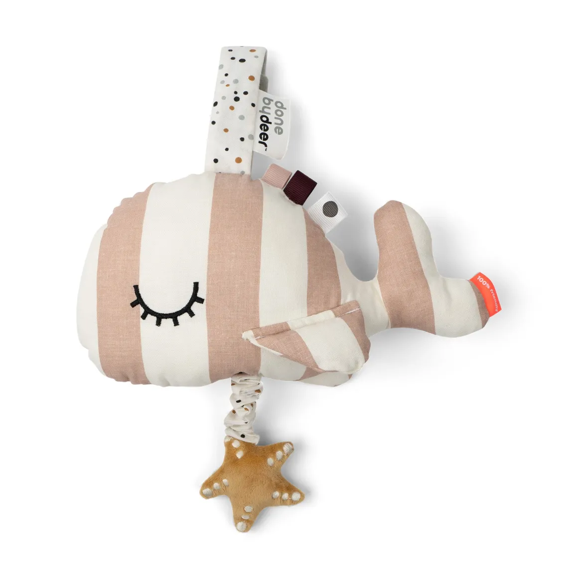 Den søvnige hval med bløde pudderstriber har søde detaljer som kontrastfarvede prikker og en blød søstjerne. Den vil berolige dit barn, når det er tid til at slappe af eller tage af sted til drømmeland.