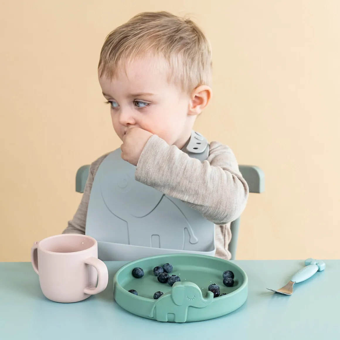 Børnene vil nyde at have den søde elefant med til måltidet – og pas på, Elphees lange snabel stjæler måske en bid. Den praktiske tallerken er i en blød grøn farve, der matcher Peekaboo-serviset, og leveres i en flot dekoreret gaveæske.