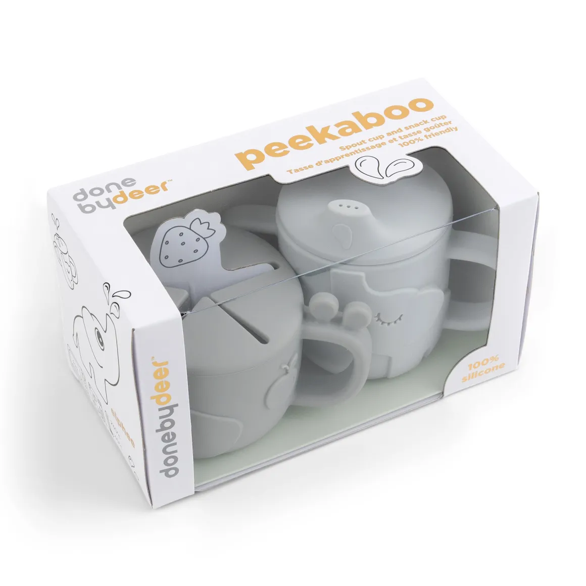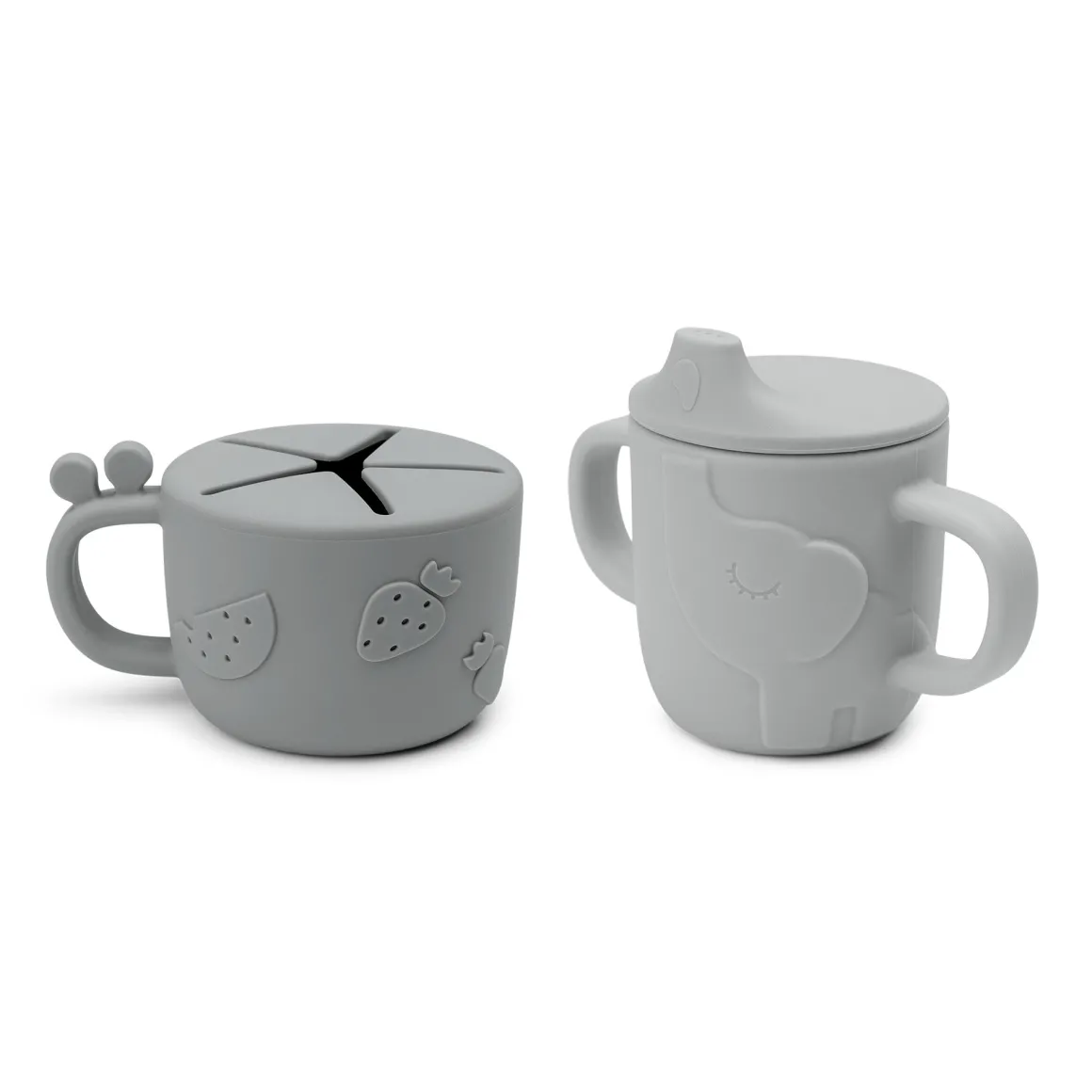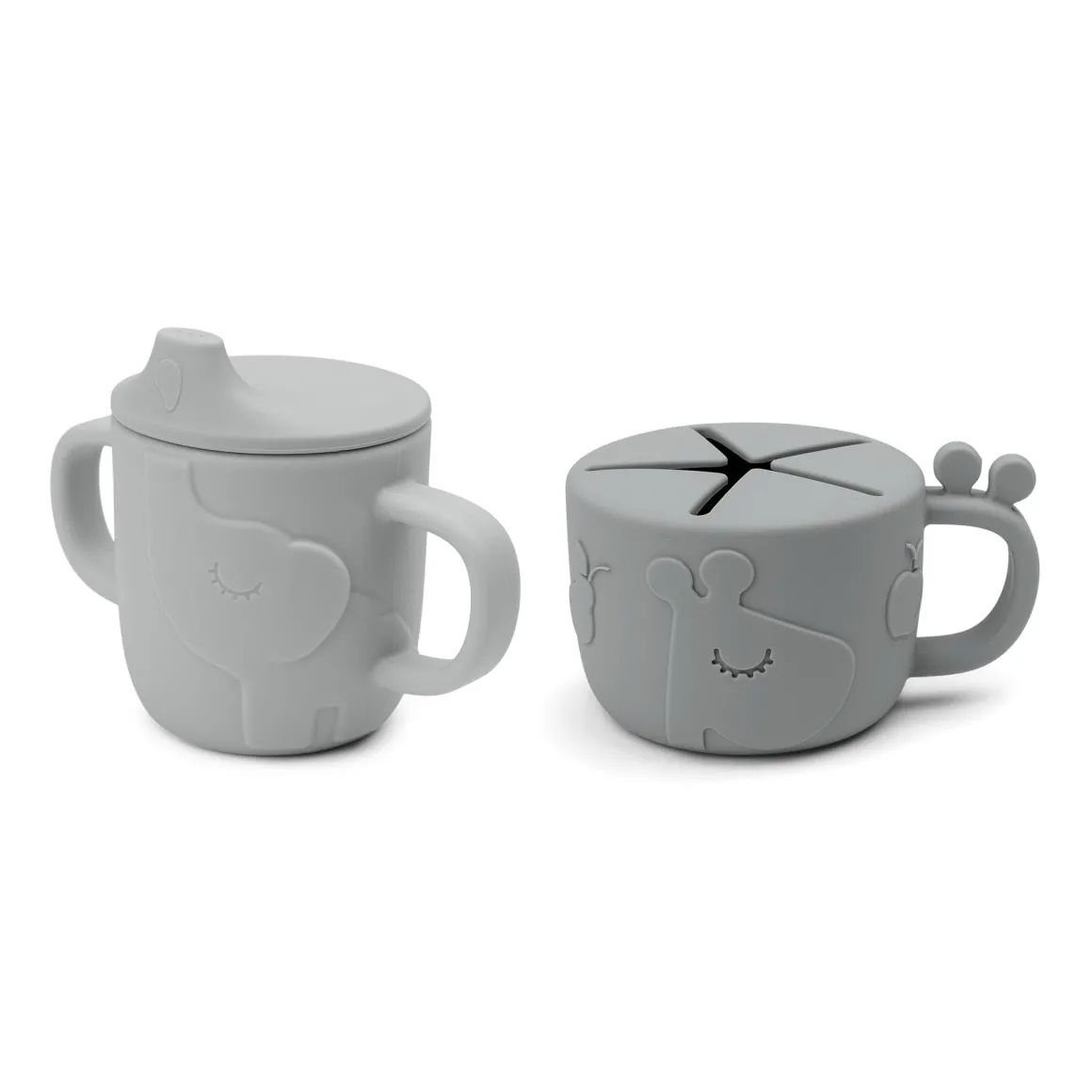 Den søde grå kop med giraffen og elefanten er lavet af fødevaregodkendt silikone, som gør den brudsikker og giver et godt greb.