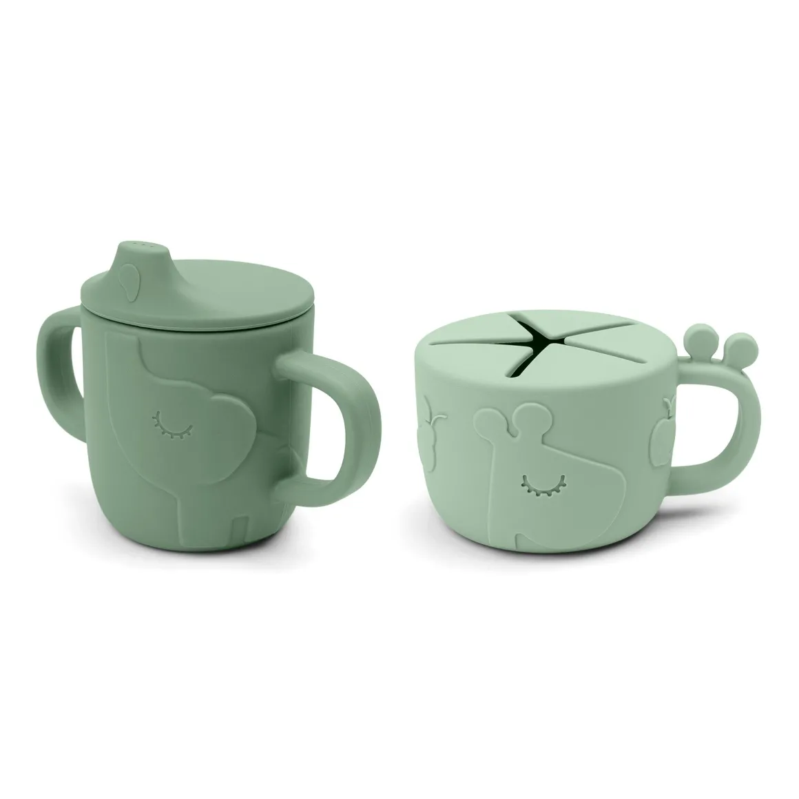 Den søde grønne kop med giraffen og elefanten er lavet af fødevaregodkendt silikone, som gør den brudsikker og tilføjer grebvenlige funktioner.