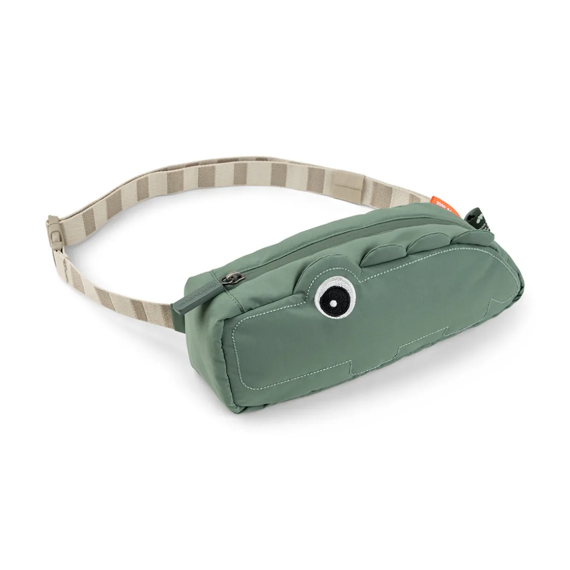 Tasken er designet med et broderi af Croco og krokodilletakker øverst. Den er nem at åbne med den vandtætte lynlås, og indeni er der et navneskilt. Cross-over tasken er vandafvisende og er lavet af genanvendt polyester fra 5 genbrugte PET-flasker.