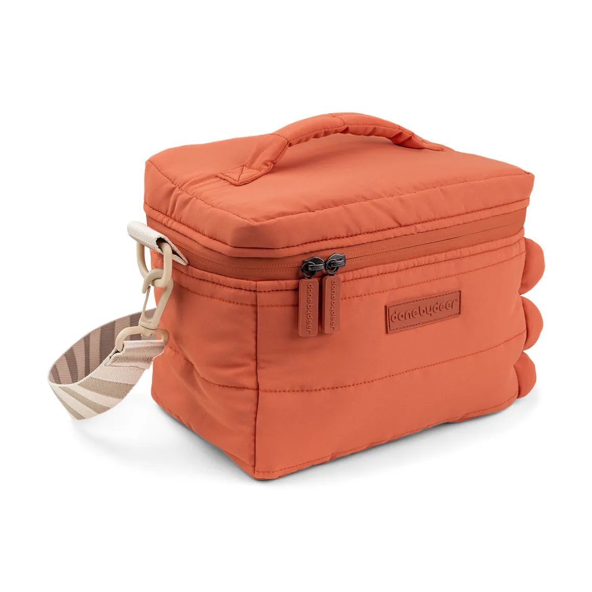 Den smarte termofrokostpose er designet i en cool papaya-farve med Done by Deer-signaturstriberne på skulderremmen. Croco-skæl springer ud på siden. Leveres uden køleelementer.