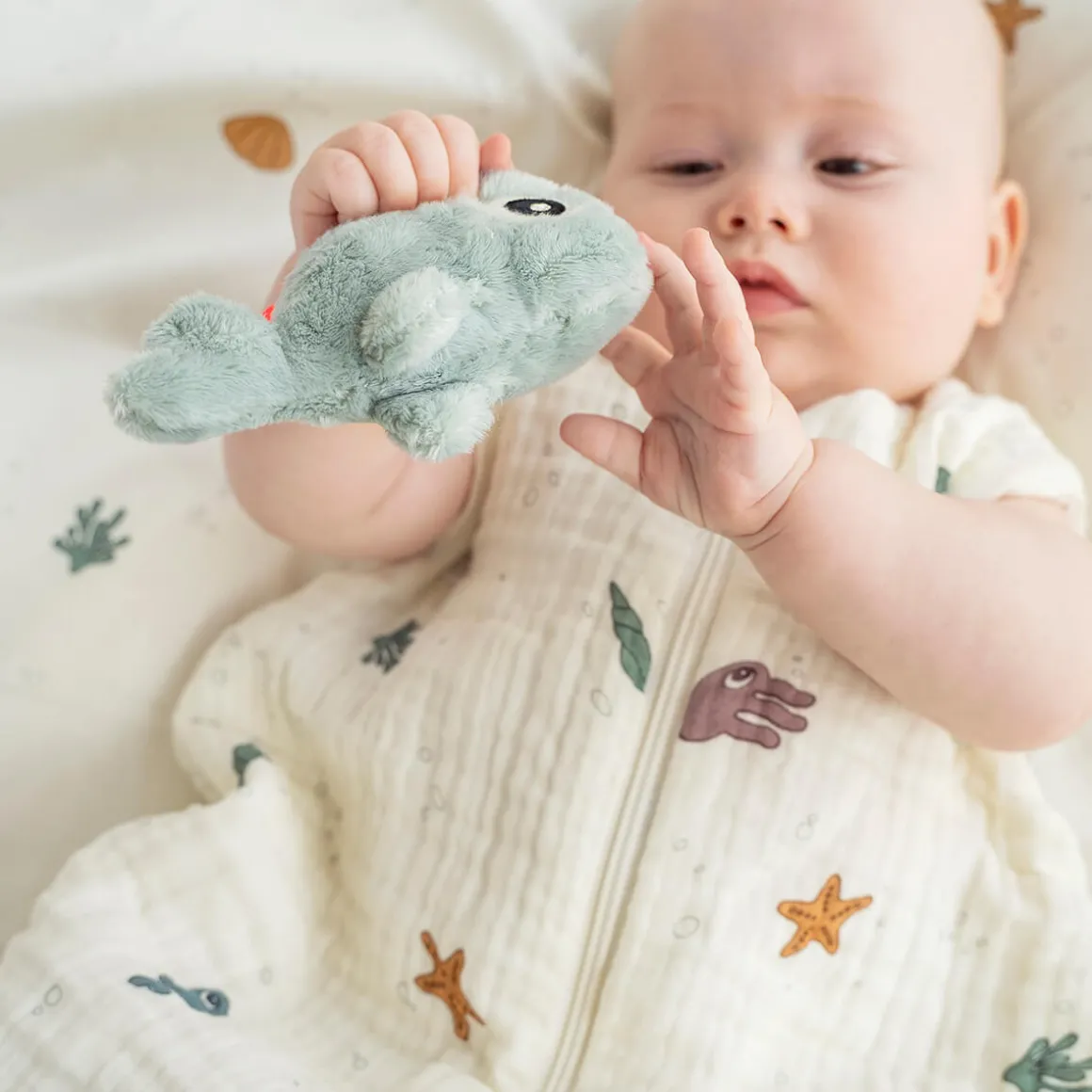 Med den elastiske løkke er det nemt at fastgøre den lille sanselegetæppe til en legemåtte, klapvogn, autostol eller aktivitetscenter ved hjælp af en Ophængsring. Den superbløde lille hvalrangle har en blød blå tone.