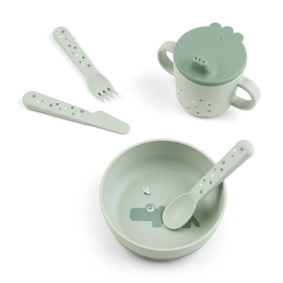 Lad din lille spiser nyde et måltid fra Foodie-bundtet til det første måltid. Det grønne bundt er trykt med et sejt motiv af krokodillen Croco, der kigger på et par ildfluer. Crocos nysgerrighed vil inspirere dit barn til at udforske maden på tallerkenen.