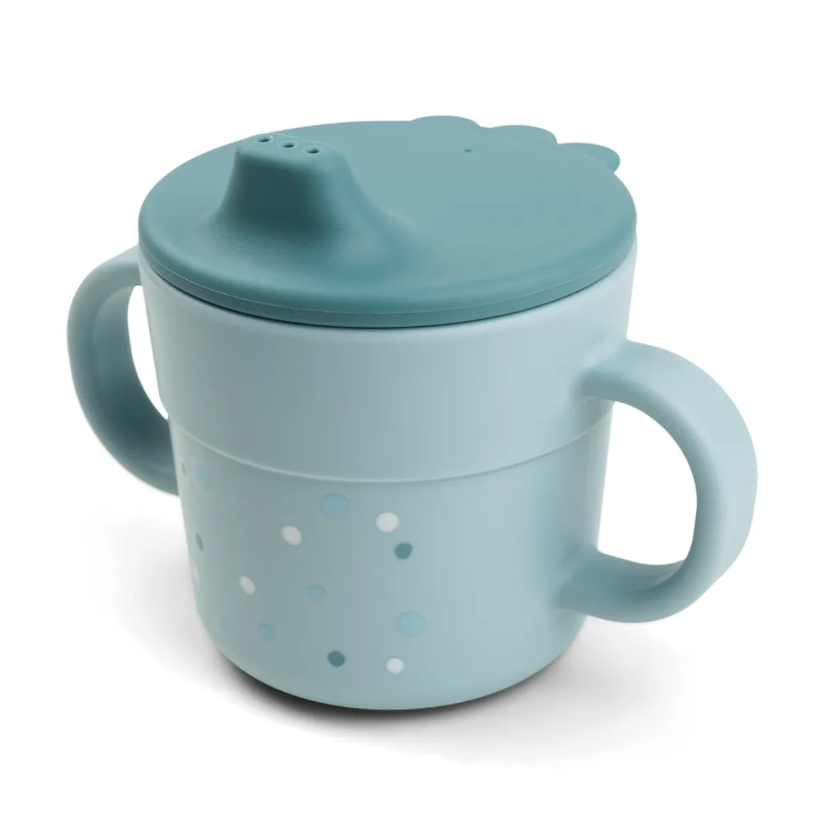 Skålsættet er perfekt til småspisere og indeholder en skål, en kop med tud og et bestiksæt.