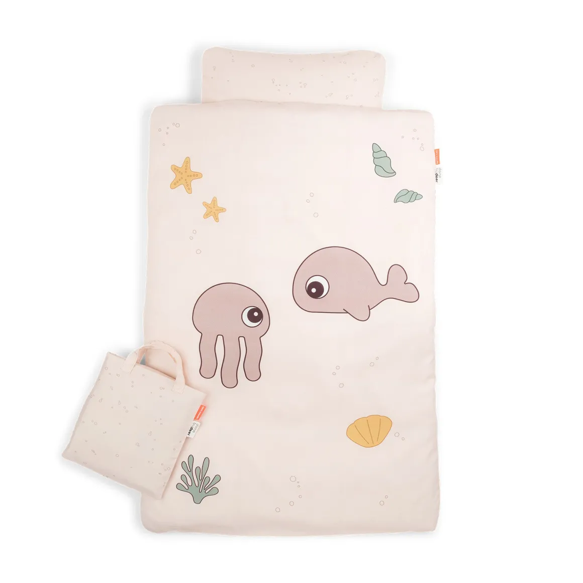 Sengesættet har en overordnet pudderfarve med havlivselementer som skaller, koralrev, søstjerner og de to Sea Friends Jelly og Wally i toner af pudder, sennep og grøn. Bagsiden er dekoreret med et sødt bobleprint, der matcher tote bagen.