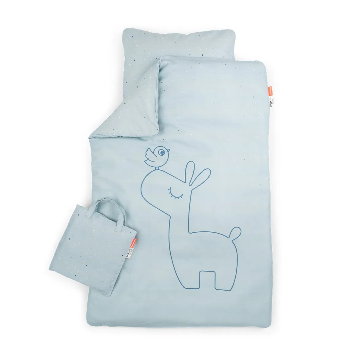 Lama-babysengetøjet er pakket i en lille Tote bag, der matcher sengesættet og kan bruges til legetøj, skiftetøj, sko eller andre praktiske formål. Sengetøjet har en praktisk YKK-sikkerhedslynlås i både pudebetræk og dynebetræk.