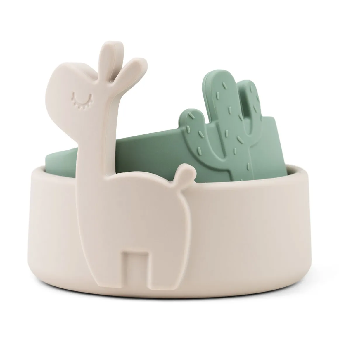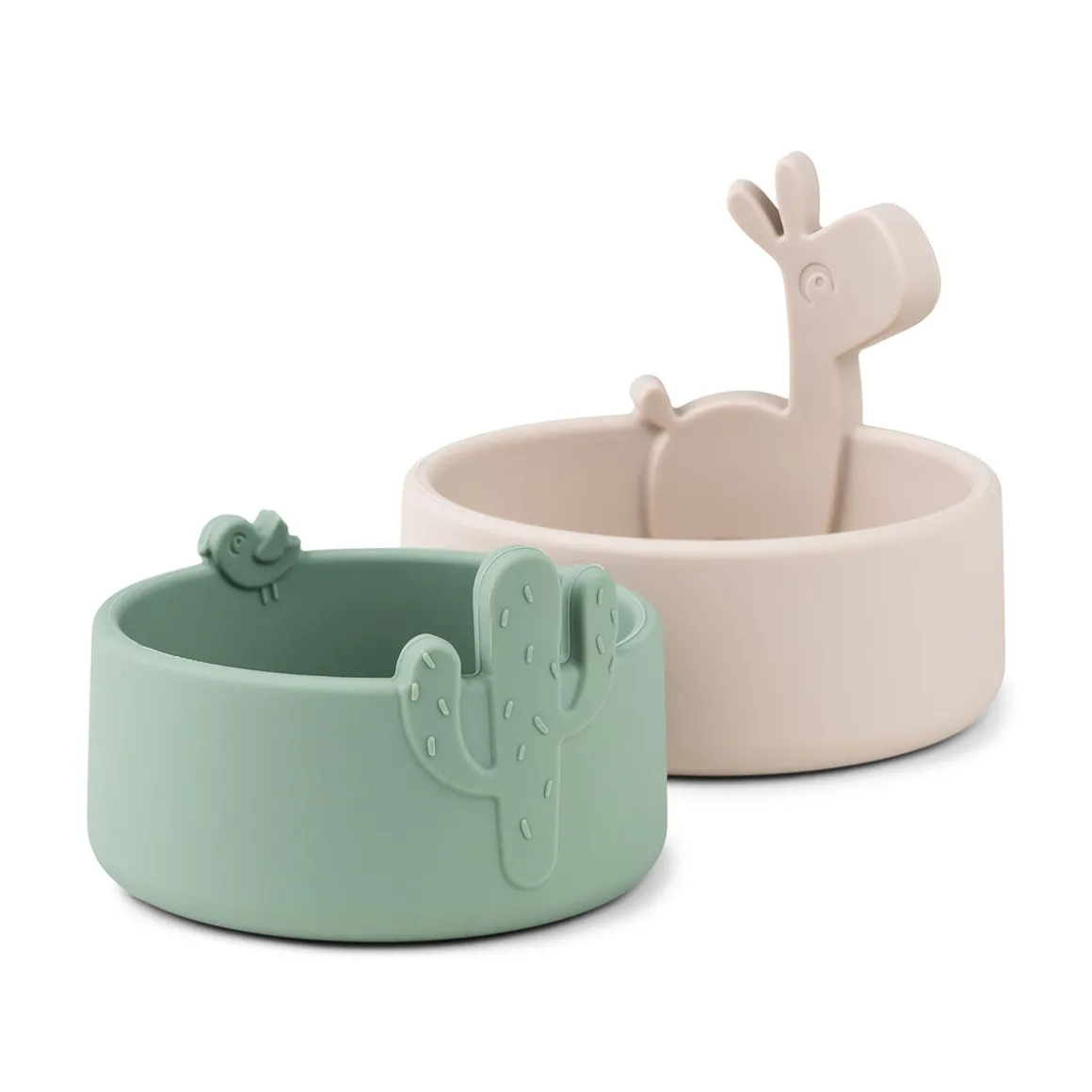 Børnene vil nyde at dele snacks med Lalee og Birdee – men pas på, Lalee har næse for slik og godbidder. På den store skål i en blød sandfarve titter Lalee frem fra kanten, mens Birdee og en kaktus popper frem fra den lille grønne skål.