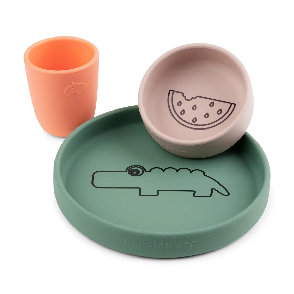 En grøn Pudder/Koral-tallerken, en vandmelon-skål og et frisk koralrødt minikrus gør dette spisesæt til en perfekt gaveidé til småspisere.