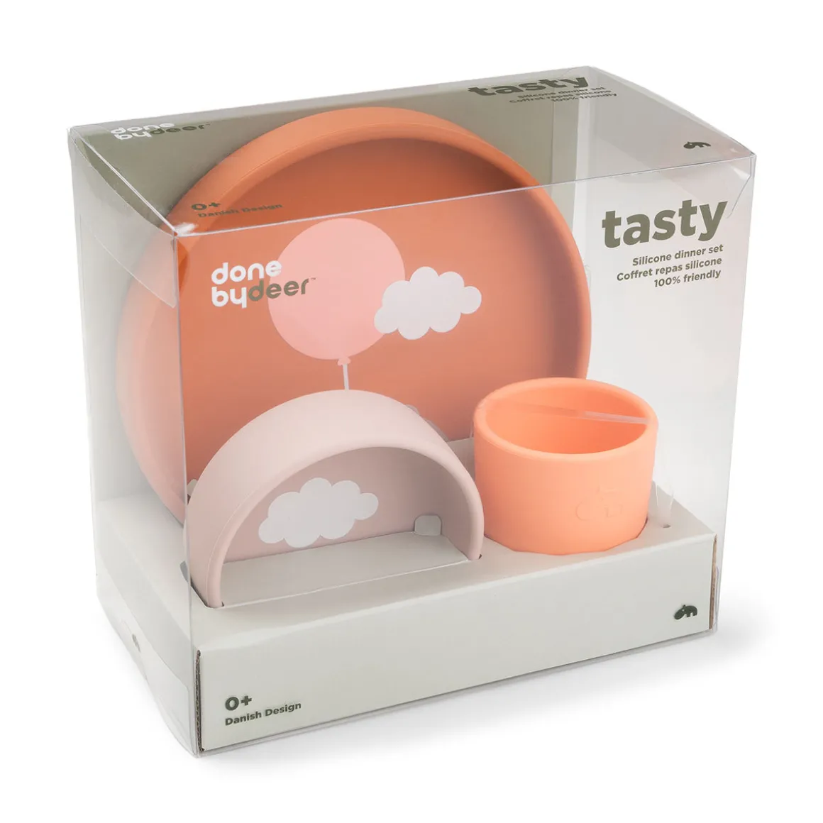 Silikone spisesættet med Happy Clouds vil gøre måltiderne sjove. Det praktiske, skridsikre og grebsvenlige silikone startsæt indeholder en børnetallerken, en skål og et mini kop. Perfekt service til både babyer og småbørn.