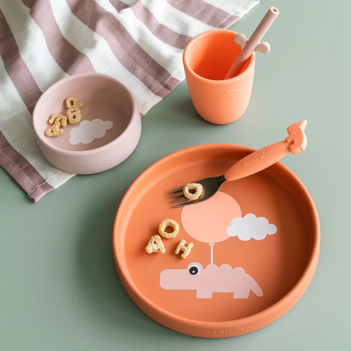 En papaya-farvet Croco-tallerken, en puddersky-skål og et frisk koral-minikrus gør dette børnemåltidssæt til en perfekt gaveidé til småspisere.
