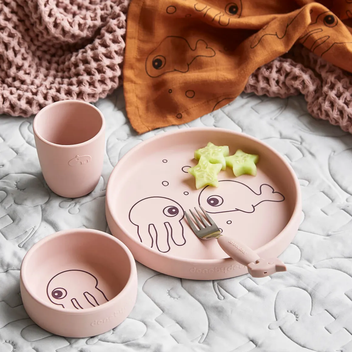 Det praktiske, skridsikre og grebsvenlige Silikone spisesæt i pudder indeholder en tallerken, en skål og et mini kop. De afrundede inderkanter gør det nemt for de mindste at øse maden op.