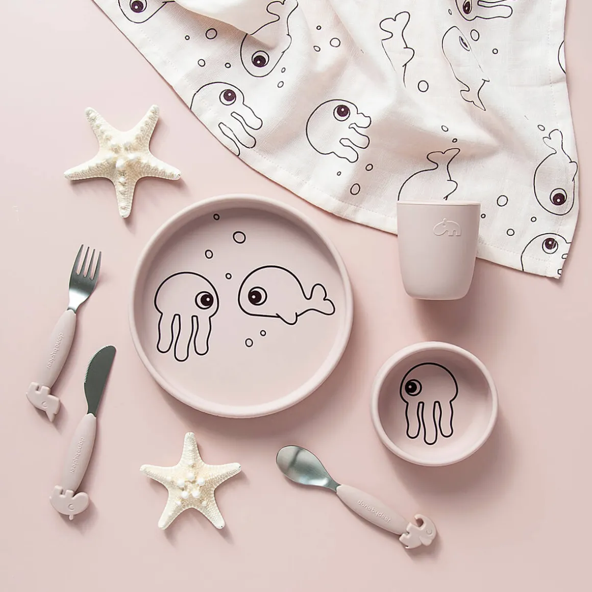 Silikone er blødt og holdbart, varmebestandigt og velegnet til brug i mikrobølgeovn, ovn og fryser. Sea Friends spisesæt er en perfekt gaveidé til små spisere.