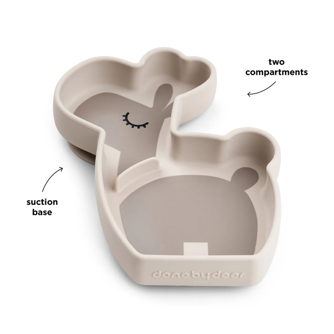 Denne Lalee Stick&stay snack tallerken i en blød sandfarve er lavet af 100% fødevaregodkendt, BPA-fri silikone, hvilket gør den helt sikker for dit barn. Sugebasen forhindrer dit barn i at skubbe, tippe eller kaste tallerkenen. Under Lalees hale og øre gemmer der sig to flapper, som er lette at løsne, og som gør det nemt at løfte tallerkenen fra bordet.