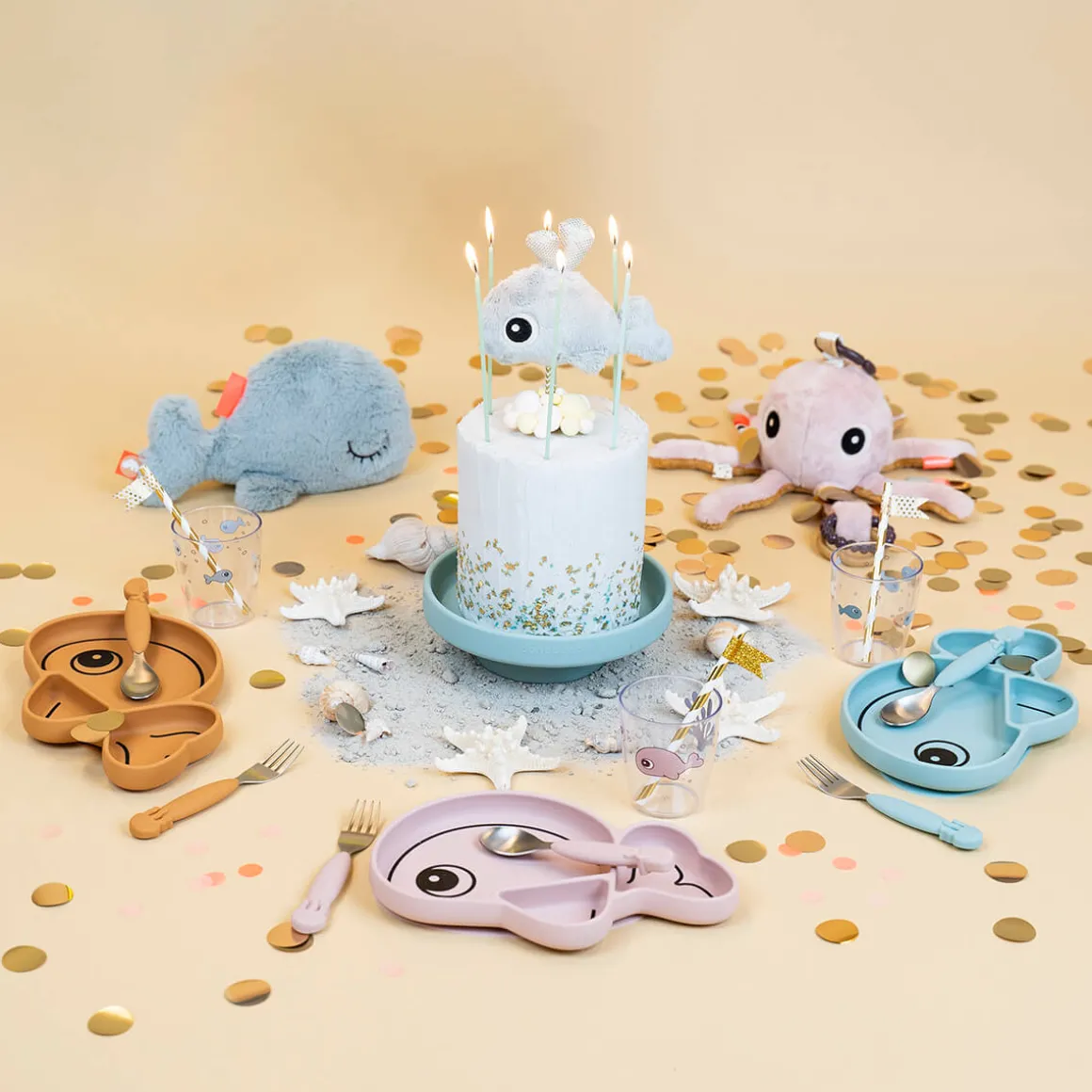 Den praktiske børnetallerken har en varm sennepsfarve med sort konturprint. Hvalen Wallys form gør den ekstra sjov at bruge. Med sine praktiske funktioner og sit søde design er denne tallerken perfekt til børn, der er begyndt at spise selv.