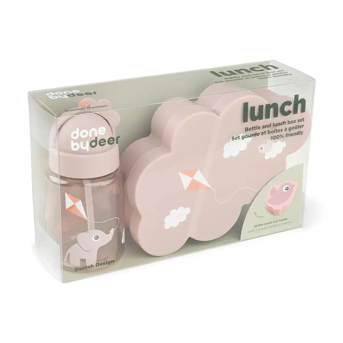De søde illustrationer af Birdee og Elphee, der flyver med drage, sætter et legende præg på måltiderne. Vores sæt med madkasser og snackbokse er ideelt til børnehave, skole og udendørs eventyr og sikrer, at dine børn er velforsynede og stilfuldt udstyrede, når de er out & about.